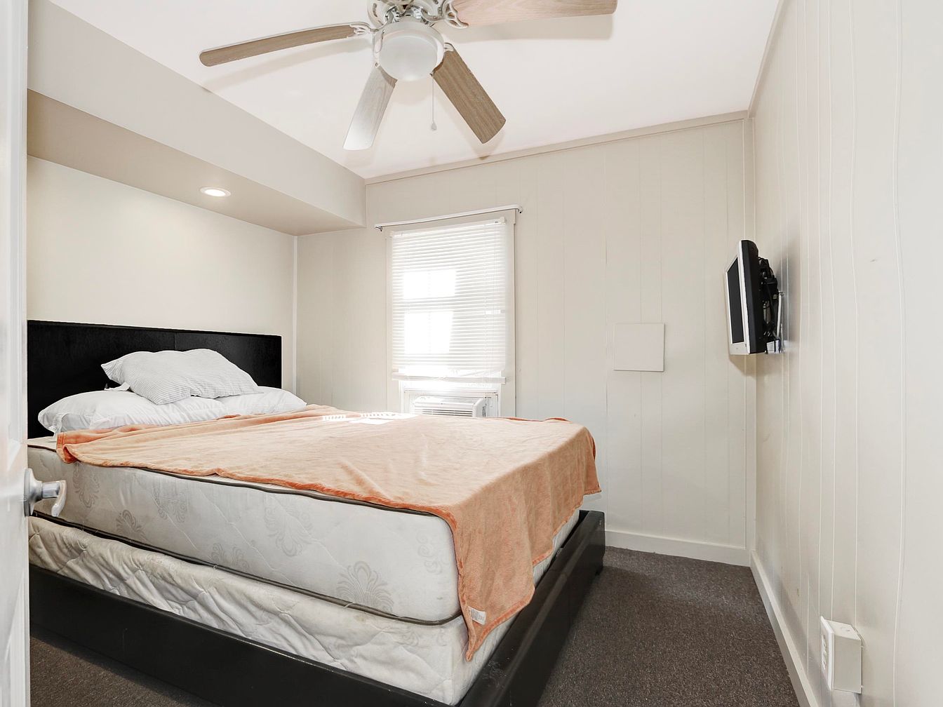 A small, tidy bedroom features a queen-sized bed positioned along one wall, topped with white pillows and a peach-colored blanket. The walls are painted a light beige, giving the space a calm and neutral feel. A flat-screen TV is mounted on the wall opposite the bed, maximizing the limited floor space. The ceiling sports a modern fan with wooden blades and a built-in light. Natural light enters through a window dressed with white blinds above a window AC unit. The carpeted floor complements the soft color scheme, and recessed lighting adds a touch of modernity to the cozy room.
