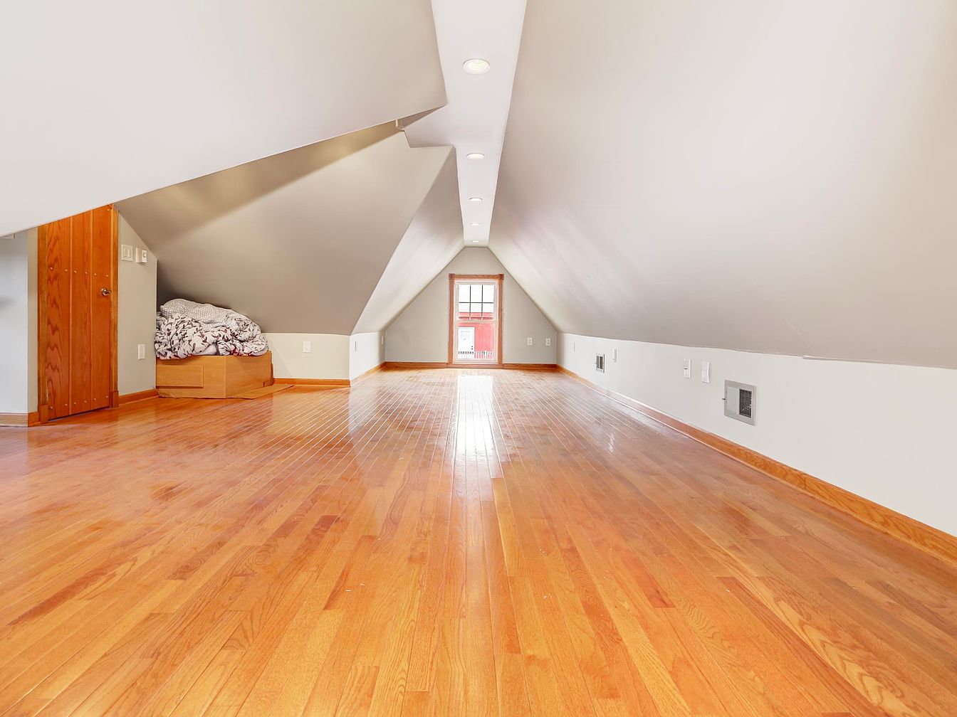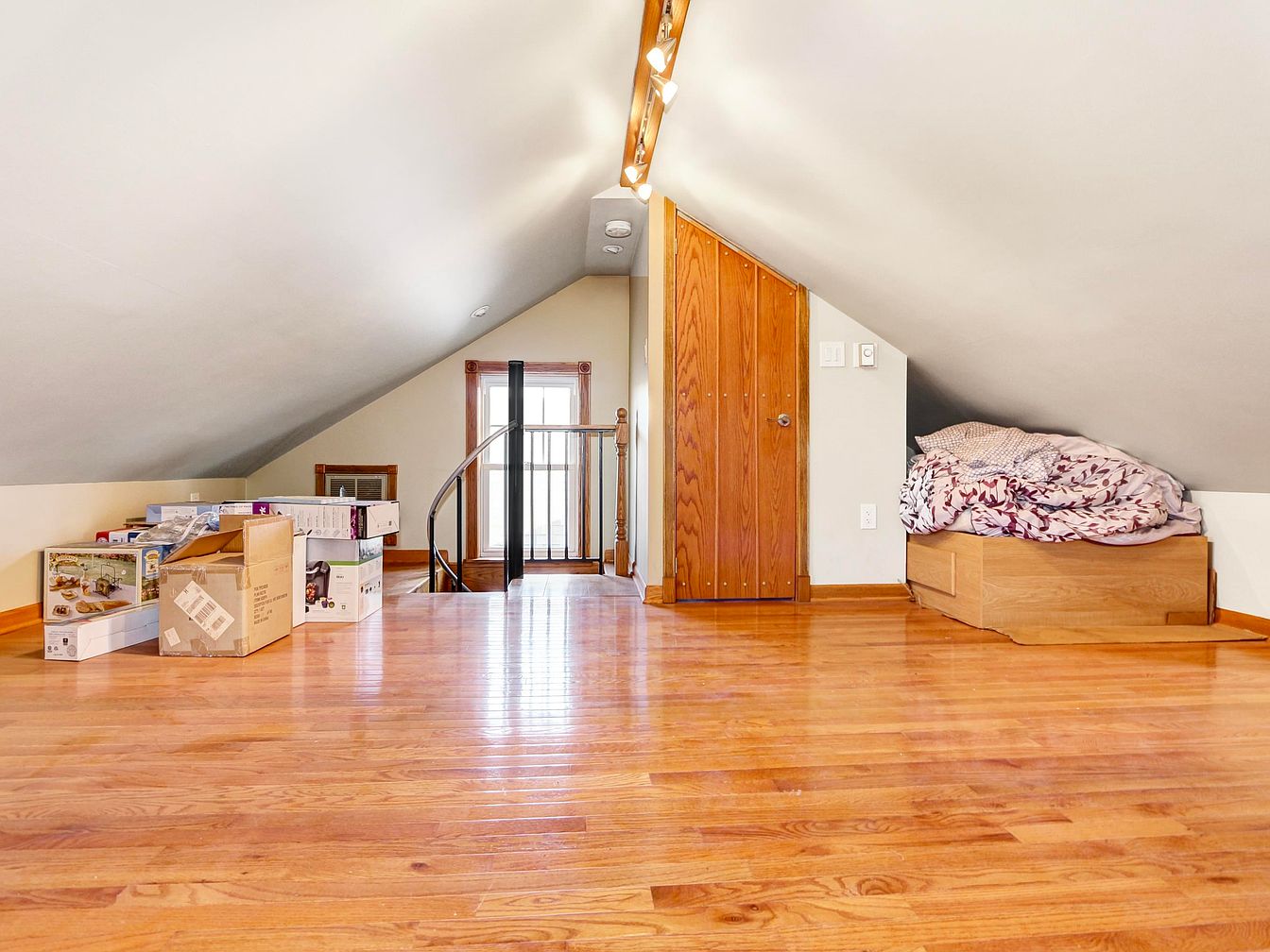 A cozy attic space with angled ceilings and warm, honey-toned hardwood flooring creates an inviting atmosphere. Along one wall, a small wooden bed with patterned bedding is tucked neatly under the slope, maximizing space. Opposite, assorted cardboard boxes and neatly stacked items suggest this area also serves as storage. A narrow wooden door with visible grain opens into a small closet or crawl space. Natural light enters from a paned glass door at the end, leading to a wrought iron spiral staircase. Recessed lighting in a wooden track brightens the otherwise intimate, sharply angled room.