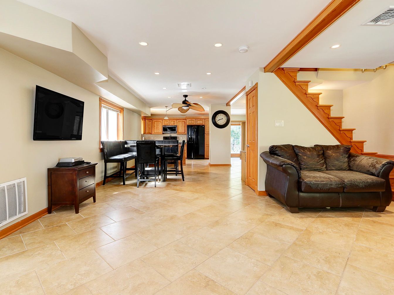 An open-concept living area blends seamlessly into a dining space and kitchen. The floor is covered with large, beige ceramic tiles, lending a warm and neutral base. The walls are painted a soft taupe, matching the medium wood trim used for baseboards, doorways, and the staircase rising at the right. A dark brown leather loveseat sits along the wall beneath the stairs. A mounted flat-screen TV and a small wooden side table are placed against the opposite wall. The dining area features a dark wood rectangular table with high-back chairs, situated near a large window letting in natural light. The kitchen at the back displays light maple cabinets, a black refrigerator, and a matching oven, enhanced with recessed lighting and a central ceiling fan. The atmosphere throughout is clean, modern, and inviting, with subtle traditional touches from the woodwork.