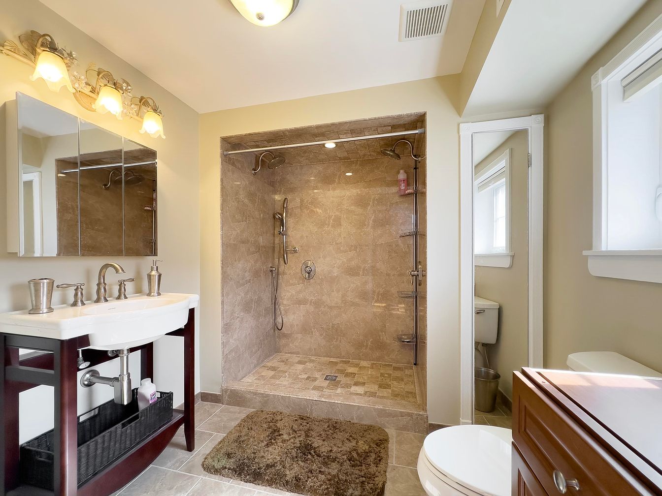 Spacious bathroom with a large, walk-in shower featuring elegant beige marble tile on the walls and floor, equipped with both handheld and overhead showerheads. The room includes a sleek white sink set in a rich, dark wood vanity with a lower storage shelf and brushed nickel fixtures. Above the sink are mirrored medicine cabinets and three decorative wall lights with frosted shades. A soft, brown bathmat sits in front of the shower, and there is a white toilet partially visible beside a wooden cabinet. Soft beige walls, a ceiling light, and ample natural light create a warm, inviting atmosphere.