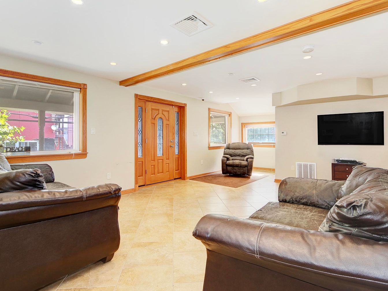 Spacious living room featuring a central double-door entrance crafted from medium-toned wood with decorative glass panels. The floor is covered in light beige tiles arranged diagonally, complementing the cream-colored walls. Rich brown leather sofas form a conversation area, while a plush recliner sits in a nook near a bright window, creating a cozy reading corner. Trimmed wood window frames and ceiling beams add warmth and subtle contrast to the otherwise neutral palette. Recessed lighting in the ceiling provides even illumination, and a flat-screen TV is mounted on the wall across from the main seating area, creating a welcoming, comfortable space.