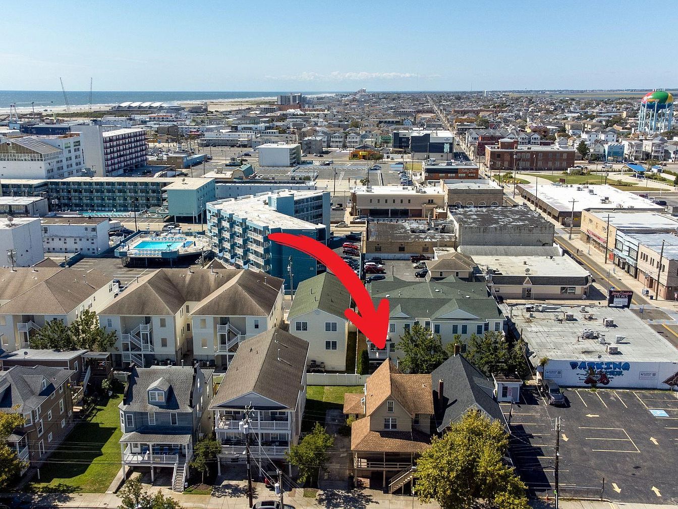 Aerial view of a coastal neighborhood with a mix of historic and modern buildings. In the foreground, a prominent arrow highlights a tan-colored historic home with a steep gable roof, wide covered porch, and multiple stories, positioned among similar houses. The home is bordered by a grassy yard and a driveway, set slightly back from the street. Surrounding properties include multi-story residential buildings with pastel exteriors, nearby commercial spaces, and a blue hotel with a rooftop pool in the background. In the distance, the shoreline and the blue ocean are visible under a clear sky, suggesting a beachside community.