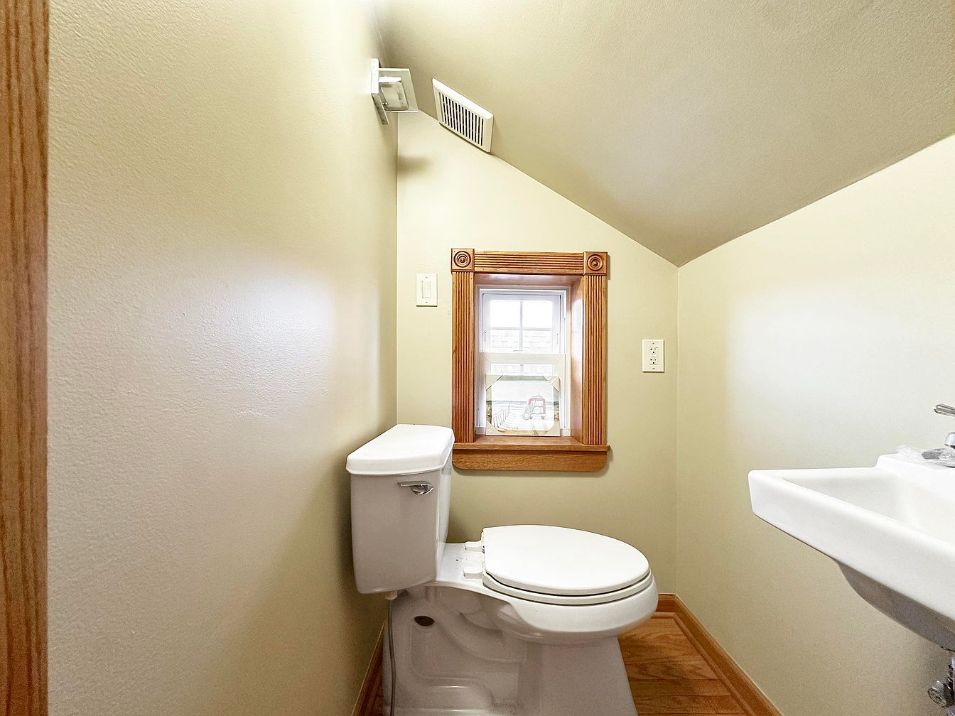 A compact bathroom nestled under a sloped ceiling with soft beige walls and natural wood trim. The space features a small, white porcelain toilet placed adjacent to a matching wall-mounted sink. A petite window trimmed in detailed woodwork allows light into the room, its sill wide enough for a modest display or storage. Warm wooden baseboards and honey-hued hardwood flooring contribute to a cozy, clean look. Subtle architectural lines from the angled ceiling create visual interest, while a simple vent and wall outlet blend into the understated, functional design. The overall atmosphere is bright, neat, and inviting.