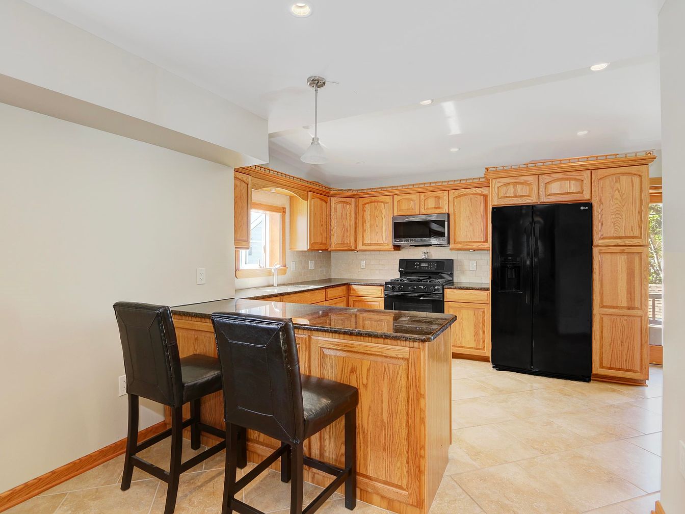 A spacious kitchen with honey-toned wood cabinetry that runs along two walls, featuring recessed panel doors and crown molding trim. The countertops are dark granite, contrasting with the warm wood tones. At the center, a kitchen island with matching cabinetry and granite top is paired with two black leather barstools, creating a casual dining or prep space. A large black refrigerator, matching black gas range, and mounted microwave offer a modern touch. Cream-colored tile flooring and soft beige walls enhance the sense of light and space, while under-cabinet lighting and recessed ceiling lights keep the area bright and inviting.