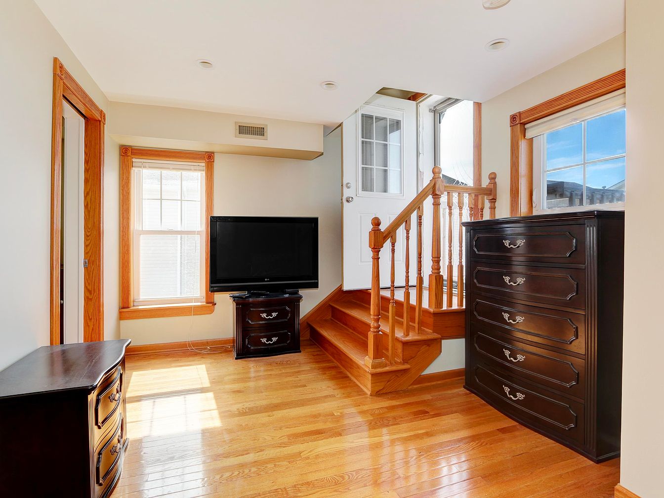 Sunlight streams through two large windows with light wood trim, filling the room with a bright and welcoming atmosphere. The floors are a warm honey-toned hardwood, coordinating with the window and door frames as well as the staircase which features turned wooden balusters and a small landing leading to a white exterior door with glass panels. Two dark, classic wooden dressers provide storage, one positioned near the stairs and another closer to the window, both featuring ornate metal handles. A flat-screen TV sits atop a matching low cabinet, blending traditional furnishings with modern technology in this cozy transitional space.