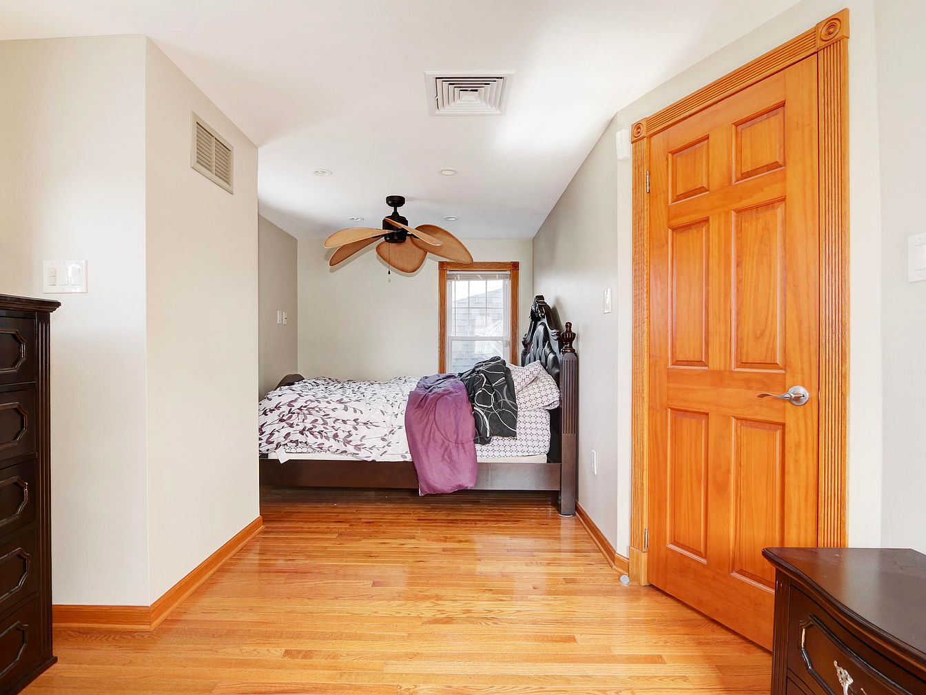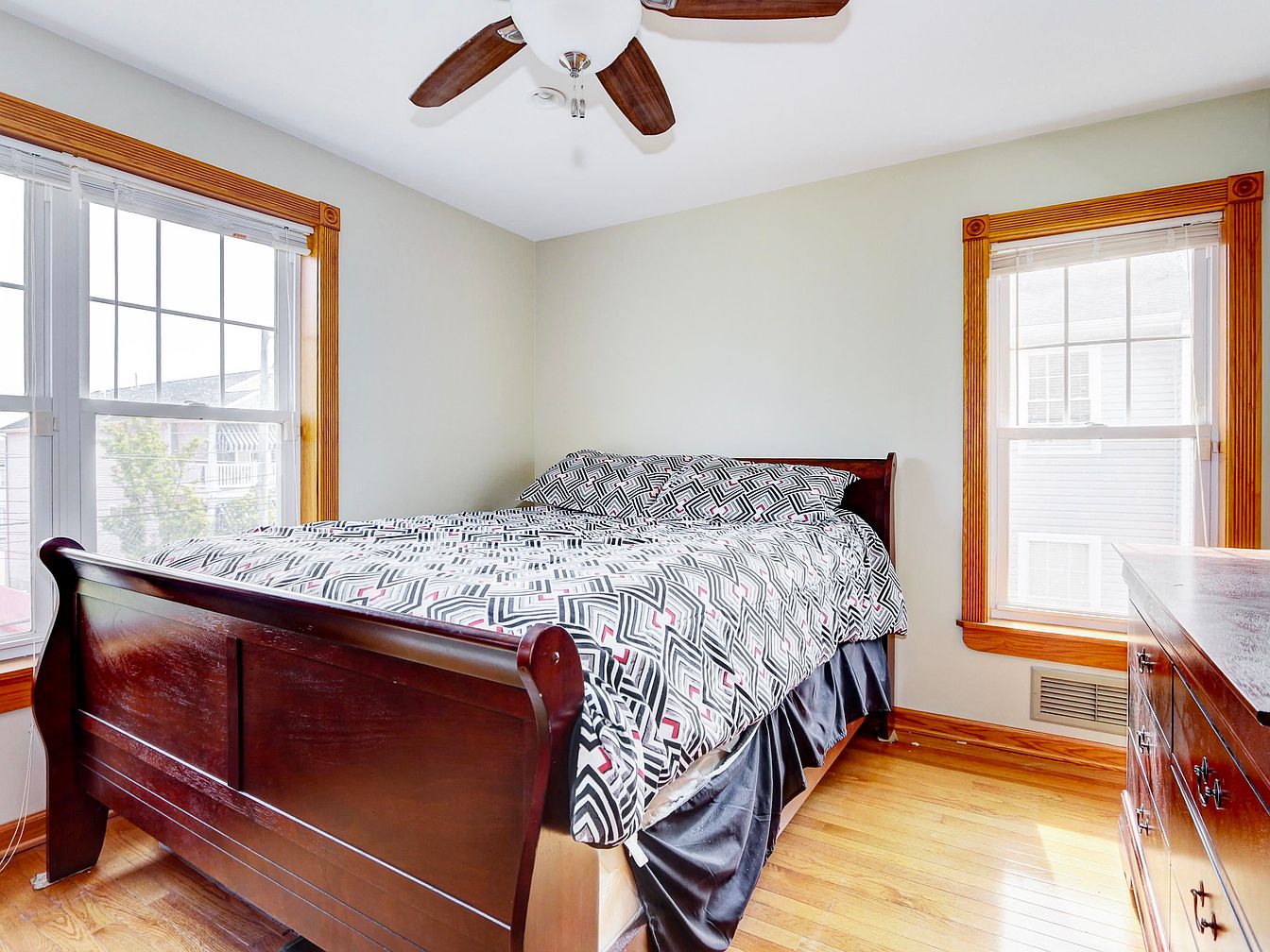 Compact bedroom featuring a double bed with a dark wooden sleigh frame set against a light beige wall. Natural light streams in from two large, double-hung windows trimmed in honey-colored wood, brightening the space and enhancing the warmth of the hardwood floor. The bed is dressed in patterned bedding with geometric designs in black, white, and accents of red. To the right, a matching wooden dresser sits beneath another window, continuing the classic, cohesive aesthetic. A ceiling fan with wood-toned blades provides gentle circulation, emphasizing a cozy, traditional atmosphere in this intimate corner of the house.