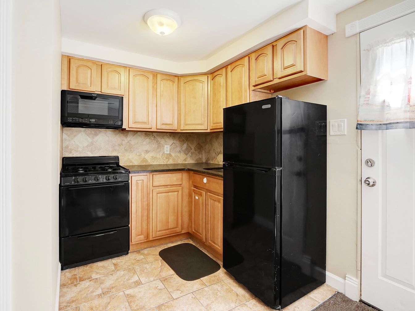 A compact kitchen corner features honey-colored wooden cabinets with raised panel doors, creating a warm and inviting atmosphere. The countertops are dark and contrast with the lighter tones of the cabinetry and the tan, diamond-patterned tile backsplash. Appliances, including a freestanding black stove and matching refrigerator, add a modern touch with their glossy surfaces. The microwave is positioned above the stove, efficiently maximizing space. Neutral tile flooring complements the overall palette. A small window on the back door is dressed with a short curtain featuring a subtle pattern, adding a hint of charm and natural light to this functional and neatly arranged kitchen space.