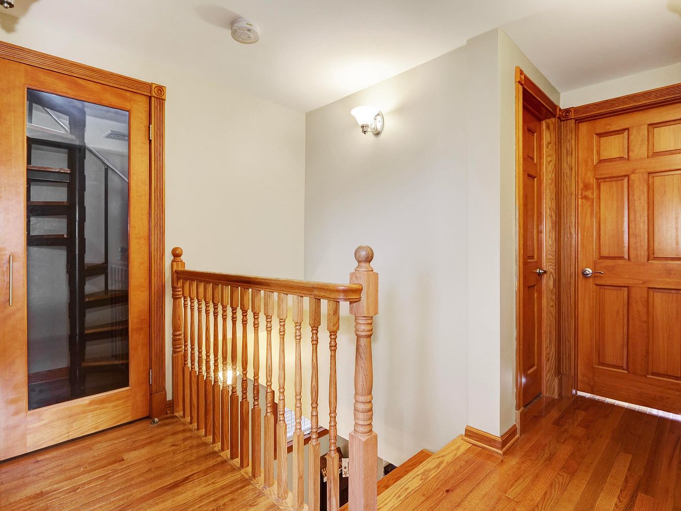 A small upstairs landing area features honey-toned hardwood floors and matching natural wood trim throughout. On the left, a wooden door with a large glass panel reveals a spiral staircase, lending a touch of modernity to the traditional woodwork. A wood banister with turned spindles lines the stairwell, creating a sense of openness while maintaining safety. The right side shows two paneled wooden doors, likely leading to bedrooms or closets. Walls are painted a soft, warm beige, enhancing the brightness provided by a sleek, chrome wall sconce and abundant natural light, for a balanced and welcoming atmosphere.