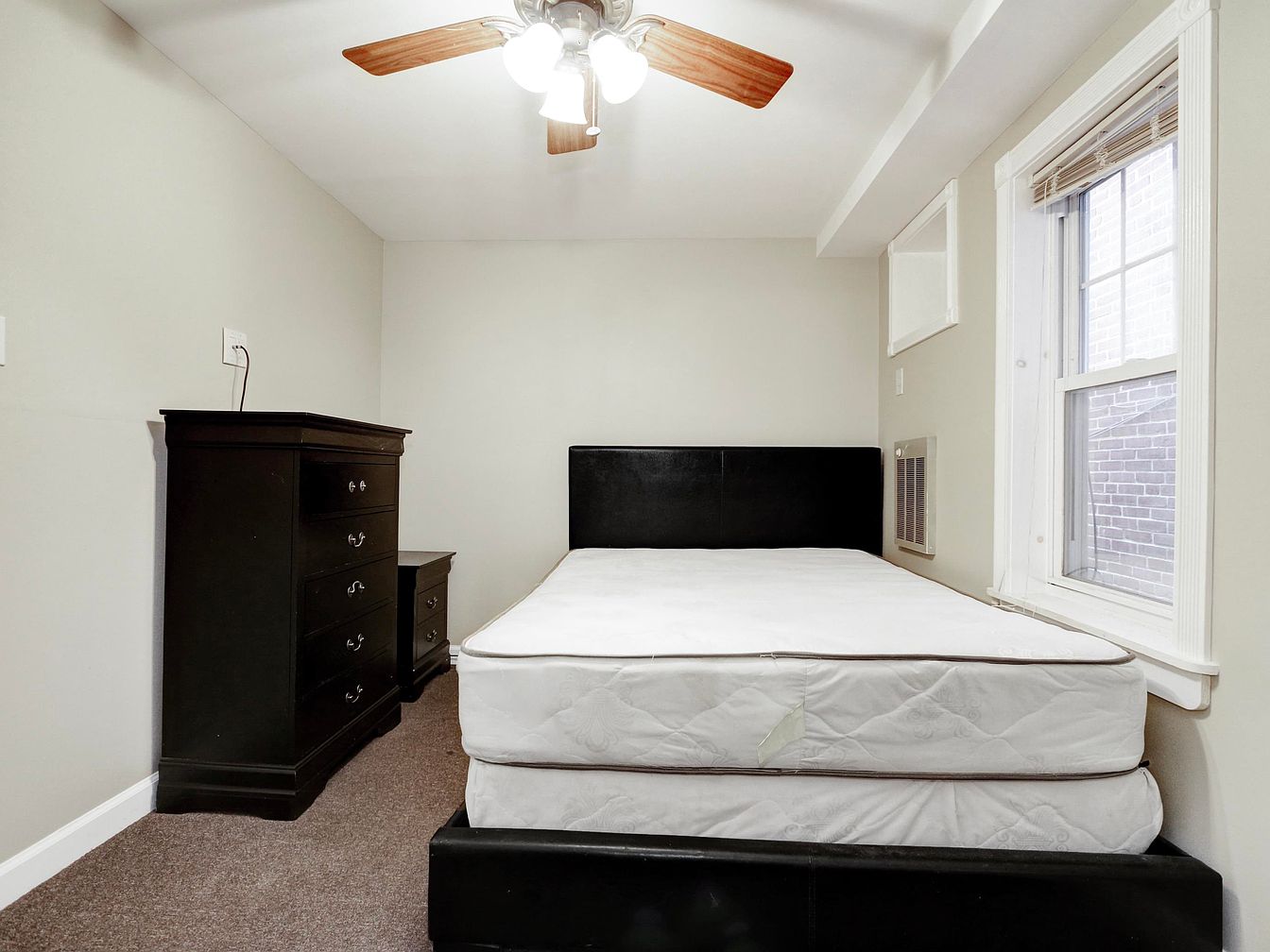A compact bedroom features a double bed with a simple, black upholstered headboard and a stacked mattress, positioned against the right wall beneath a window with white trim. The color palette consists of neutral tones, with soft beige walls and light brown carpeting. A dark wood dresser with multiple drawers and a matching nightstand occupy the left side of the room. Above, a ceiling fan with wooden blades and a central light fixture hangs, providing both illumination and ventilation. Architectural details include rectangular molding around the window and minimal wall ornamentation, giving the space a clean, uncluttered look.