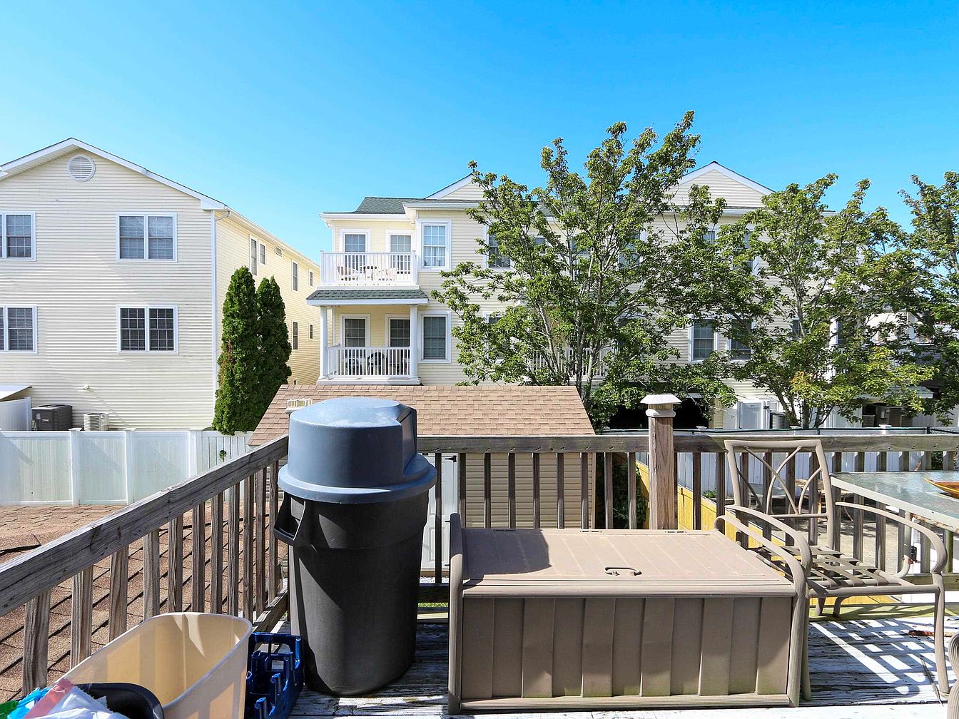 A wooden back deck with a weathered railing overlooks a suburban residential area. The deck is furnished with a beige storage box placed against the railing, next to a brown metal chair with a decorative back. On one side of the deck sits a large, gray lidded trash bin, along with a beige bin and some crates nearby. Sunlight falls across the deck, creating shadows and highlighting the rustic texture of the wood. Beyond the railing, there are leafy green trees, a small shed roof, and cream-colored townhouse buildings with white trim and balconies in the background.
