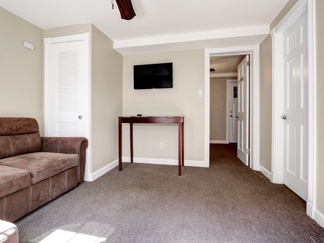 A compact living area with a neutral, calming palette featuring beige walls and white trim. A brown suede sofa sits to the left, partially in view, offering comfortable seating. The floor is carpeted in a taupe color, adding warmth and softness to the space. A simple, narrow wooden table stands against the wall beneath a flat-screen television, emphasizing a minimalist design. The area includes three white doors with paneled details, indicating access to closets or adjoining rooms, and louvered closet doors add subtle texture. The overall effect is clean, uncluttered, and functional, with natural light brightening the interior.