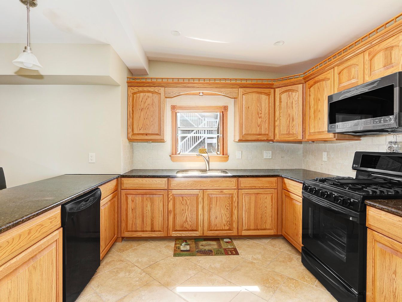 Warm oak cabinetry lines two walls in an L-shaped configuration, complemented by dark granite countertops for a classic look. Natural light filters through a wood-framed window positioned above the stainless steel sink, illuminating the beige tile backsplash. The appliances, including a gas stove, over-the-range microwave, and dishwasher, are modern and black, lending contrast to the lighter wood tones. Creamy beige tile flooring enhances the sense of spaciousness and brightness. The overall aesthetic feels welcoming, with traditional touches evident in the raised cabinet panels and modest decorative molding. The neutral wall color ensures the space feels airy and versatile.