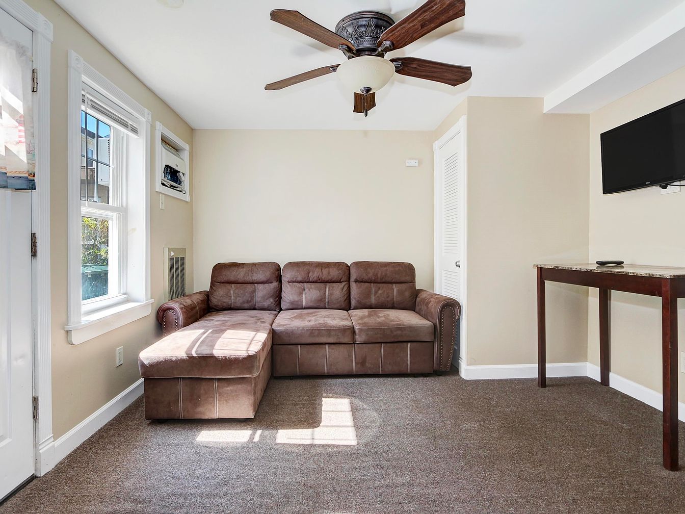 A cozy, sunlit living room corner with a taupe sectional sofa featuring plush cushions and nailhead trim. The walls are painted a soft beige, complementing the neutral brown carpeting. Natural light streams in through two white-framed windows, adding brightness and warmth. A ceiling fan with dark wooden blades and an ornate light fixture is centrally located overhead. In one corner, a wall-mounted flat-screen television faces the sofa, above a slim console table with a marble top and dark wooden legs. The room feels modern yet welcoming, with simple architecture and minimal ornamentation enhancing its comfortable appeal.