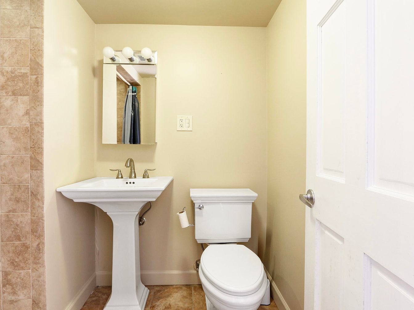 A compact bathroom with a pedestal sink and a standard white toilet positioned side by side. Beige walls and neutral-toned floor tiles enhance a clean and understated look. The left wall features large, rectangular beige tiles extending up to the ceiling, suggesting a nearby shower. Above the sink is a small mirrored medicine cabinet with three light bulbs mounted above it, providing bright, functional lighting. Hardware and faucet finishes are brushed nickel, complementing the soft color palette. The overall design is minimal and practical, prioritizing functionality and ease of maintenance without decorative embellishments.