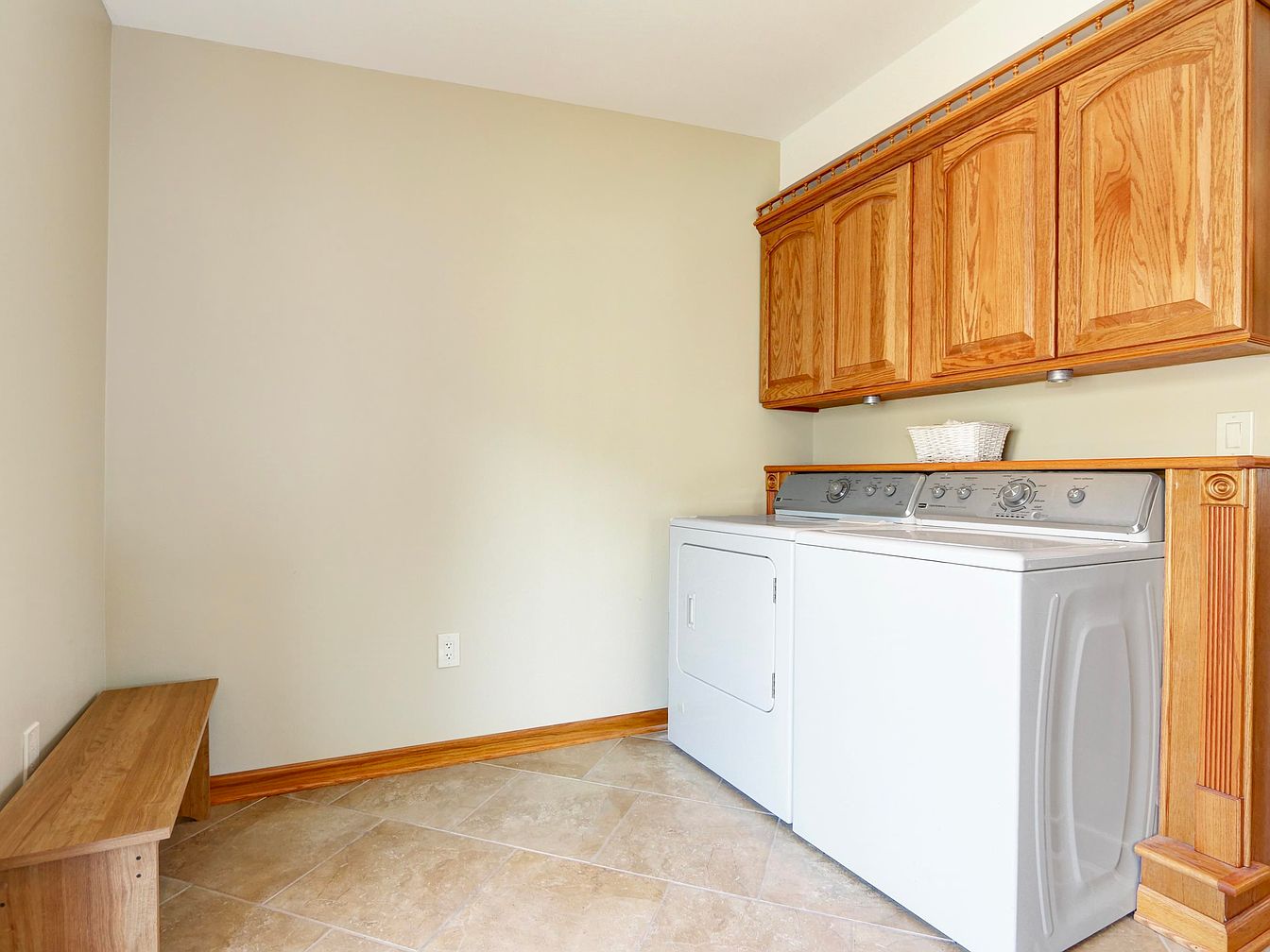 A clean, spacious laundry room with a warm, inviting feel. The space features a side-by-side white washer and dryer unit beneath a set of rich, honey-colored wooden cabinets. The cabinetry has raised panel doors, natural wood grain, and elegant crown molding along the top. A small woven basket adds a charming accent. Light beige tile flooring contrasts nicely with the medium wood baseboards and trim. To the left sits a simple wooden bench, matching the cabinetryโs wood tone. Neutral cream walls create an airy, uncluttered ambiance, emphasizing both the function and coziness of this utility space.