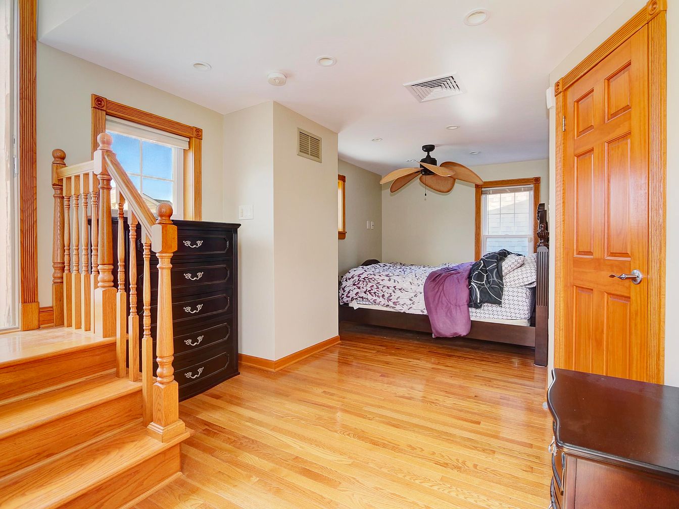 Warm wood flooring and matching wood trim define this cozy upstairs space. Stairs with turned wooden banisters lead up into an open area where a black, vintage-style dresser sits against the wall. Straight ahead, a small bedroom features a dark wooden bed accented with a white and purple patterned comforter and a folded amethyst throw. Large, leaf-shaped ceiling fan blades add a whimsical touch above. Light beige walls, recessed lighting, and generous natural light from multiple windows create a bright, inviting atmosphere that combines historic character with casual comfort.