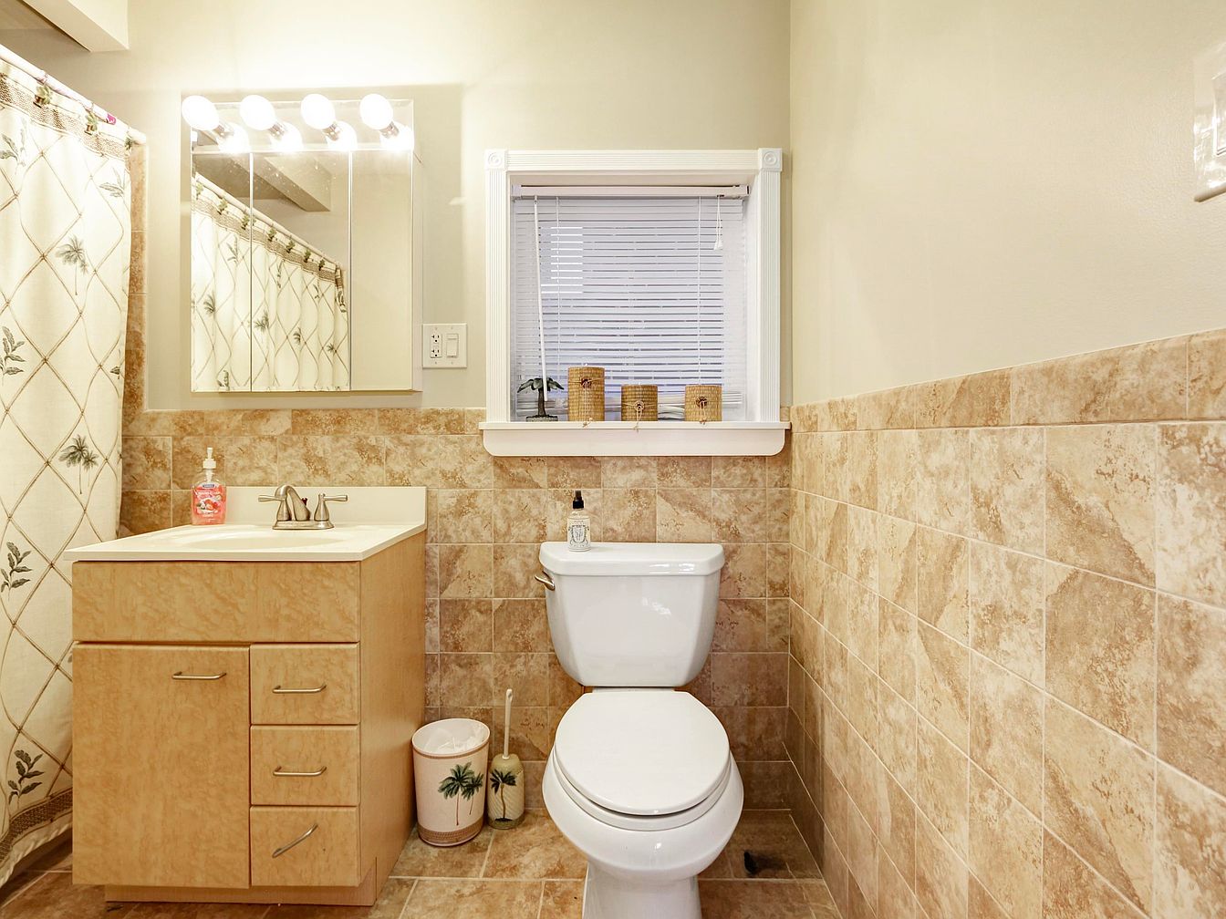 Warm beige and tan tones dominate this compact bathroom, with floor and half-wall tiling in a marbled pattern. A light wood vanity sits to the left, featuring a cream countertop, undermount sink, and brushed nickel fixture. Three drawers and a cupboard offer storage, while a pink soap dispenser adds a playful touch. Above the vanity, a rectangular mirror is framed by four globe vanity lights. Next to the vanity is a standard white toilet topped by a white-framed window with blinds. Natural light illuminates the space, which also features a palm-embroidered shower curtain and decorative palm-tree-themed waste bin and toilet brush set.