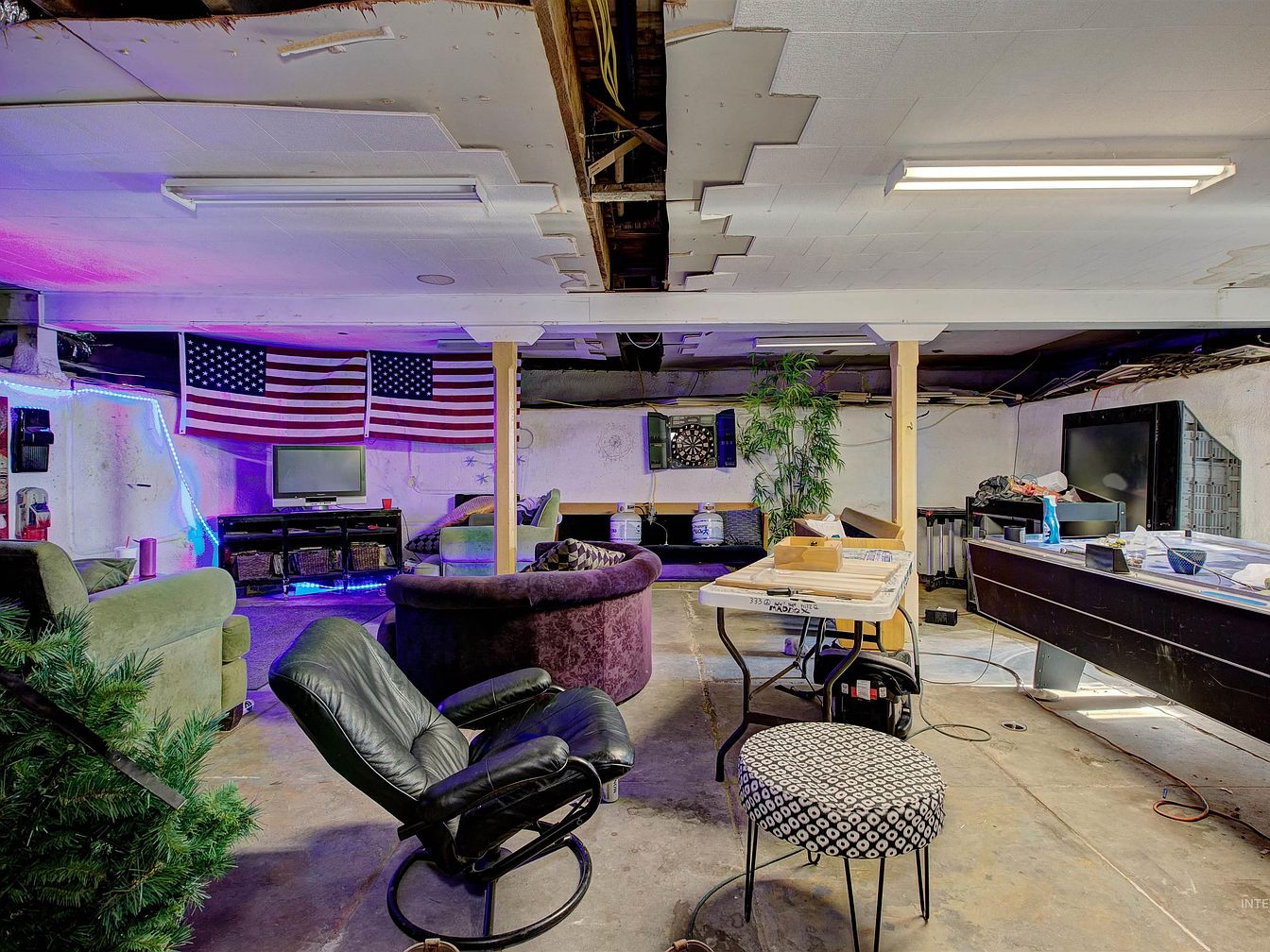 A spacious basement converted into a casual recreational area with exposed, unfinished concrete floors and a patchwork drop ceiling. Seating includes a black leather recliner, a green armchair, and a plush purple swivel chair, all arranged for comfort and conversation. There are two large American flags on the far wall, a TV, and string lights adding a playful atmosphere. Various pieces of furniture like a folding table and a round patterned ottoman emphasize the room’s multi-purpose use. Potted plants and decor, scattered games and items, and a mix of soft and practical lighting contribute to the relaxed, informal feel.