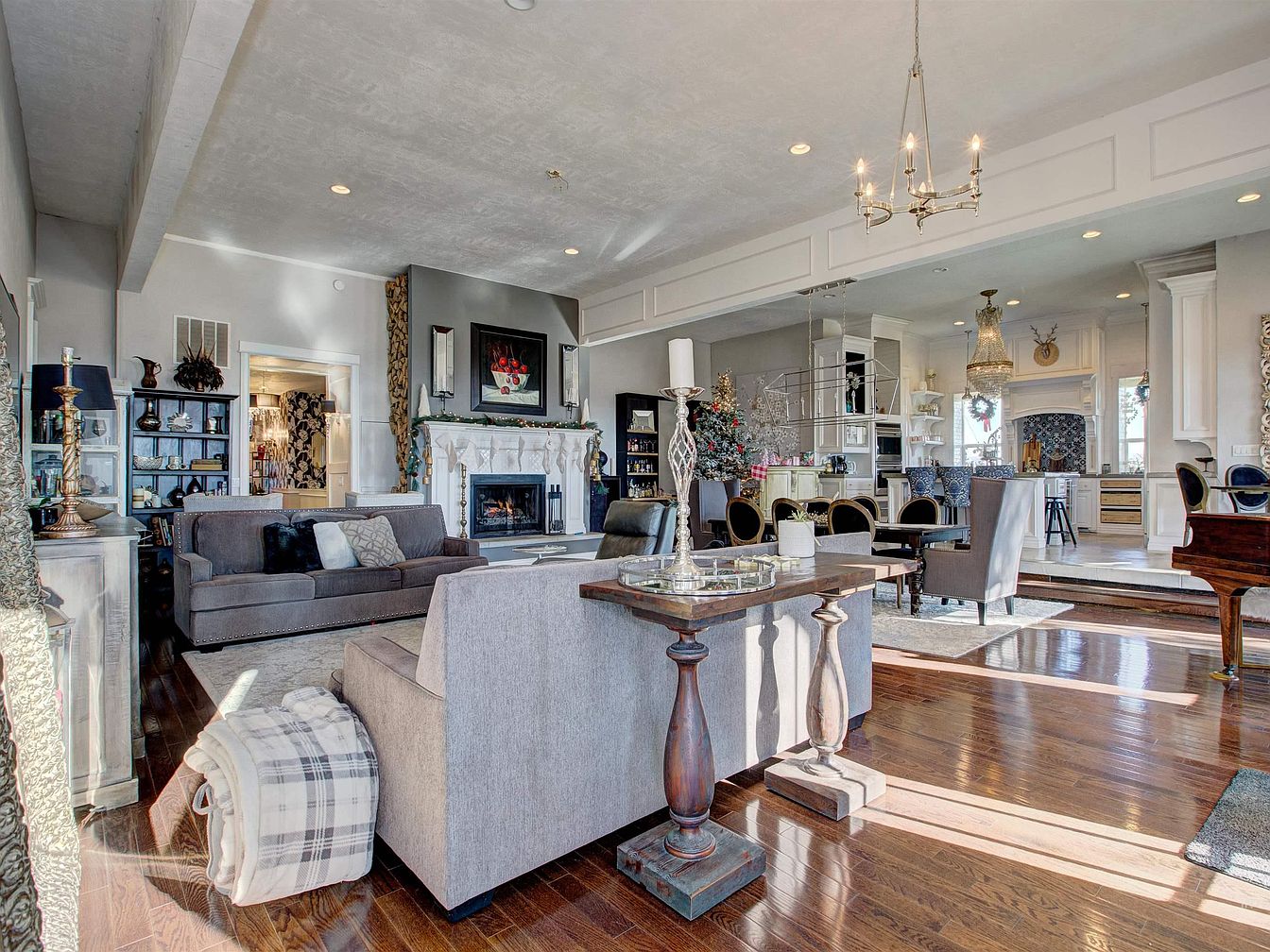 Spacious open-concept living room and kitchen area with a bright, airy ambiance. The living space features gray and taupe sofas atop a plush rug, arranged around a striking white ornate fireplace with intricate moldings and a framed painting above. Bookshelves flank the fireplace, offering both storage and display. Elegant candlesticks and a plaid blanket add touches of comfort. Hardwood floors flow throughout, leading to a dining area with upholstered chairs and a wooden table under a grand chandelier. The kitchen, slightly elevated by a step, boasts white cabinetry, marble countertops, and statement lighting, complementing the overall traditional-meets-modern aesthetic.