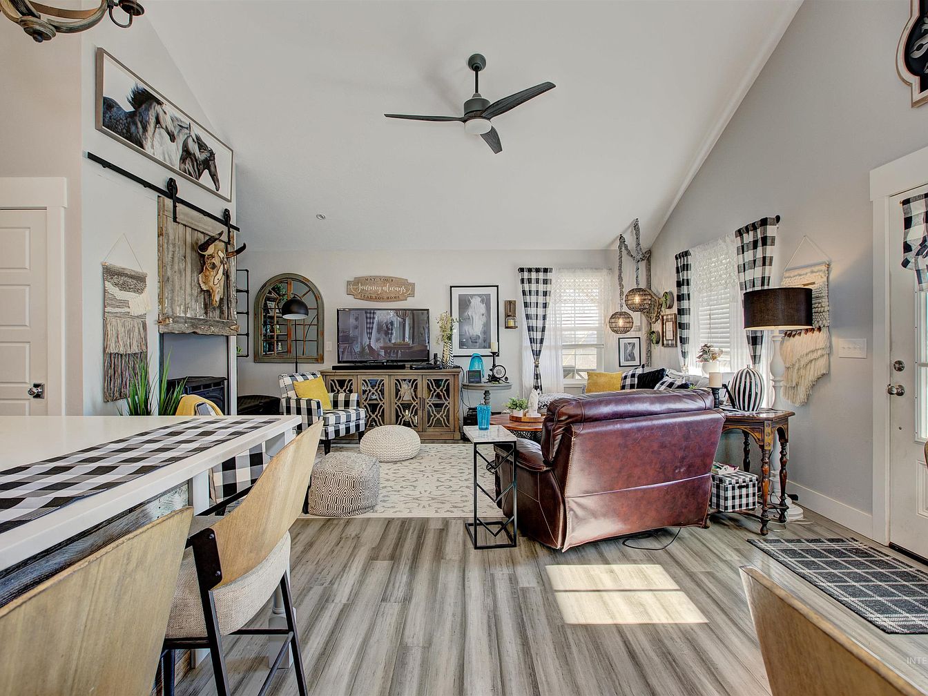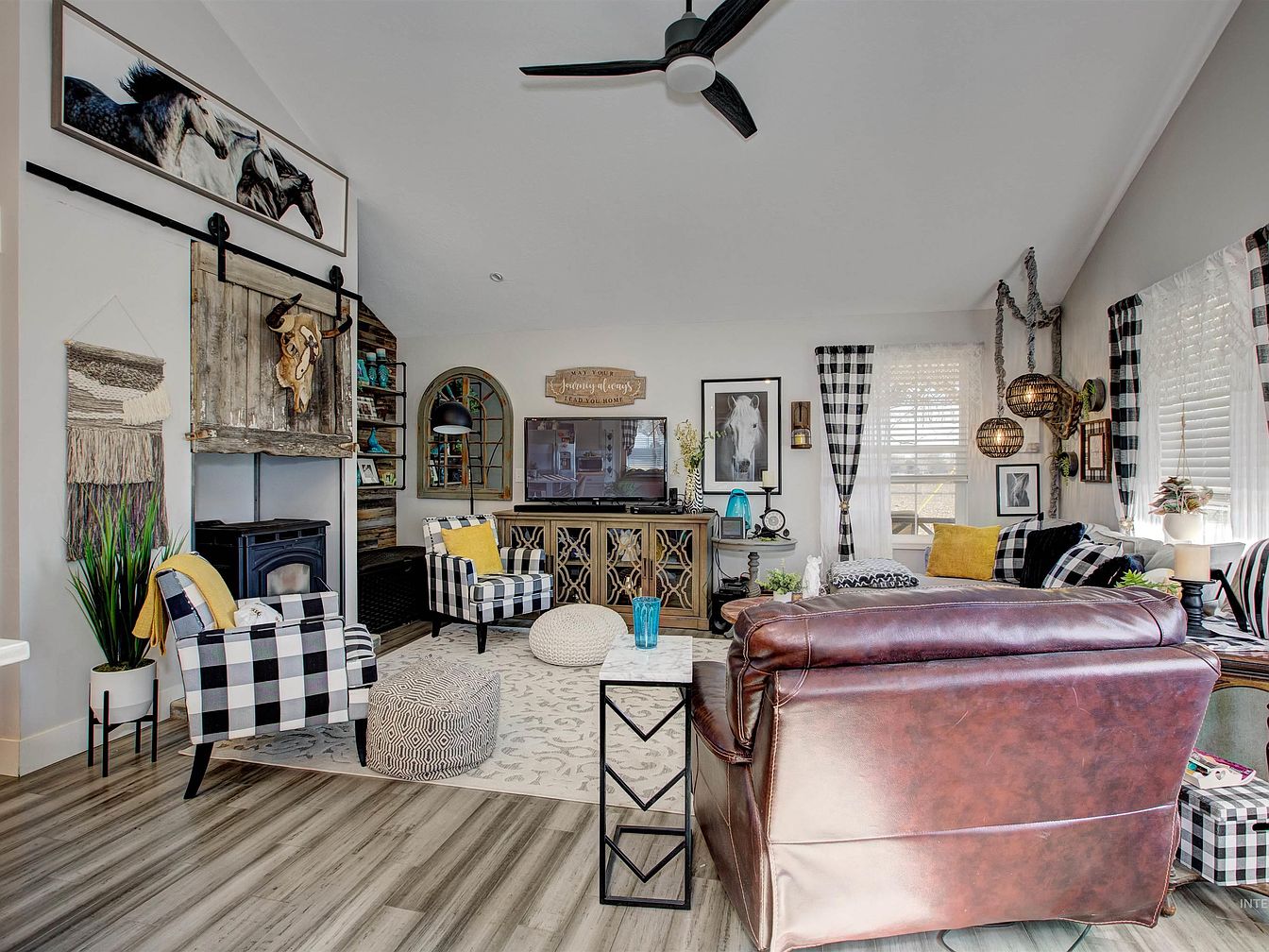 Spacious living room featuring high, sloped ceilings and neutral-toned walls, anchored by warm wood-style flooring. A brown leather sofa sits opposite two black-and-white plaid armchairs, while pops of yellow from throw pillows add vibrant contrast. Decorative elements include woven wall hangings, botanical artwork, and a rustic sliding barn door with a mounted steer skull above a wood stove. Multiple windows allow ample natural light, accented with black-and-white check curtains. A light patterned rug grounds the seating area, and woven pendant lights contribute to a cozy, eclectic feel. Plants and curated accessories add warmth and historic character throughout.