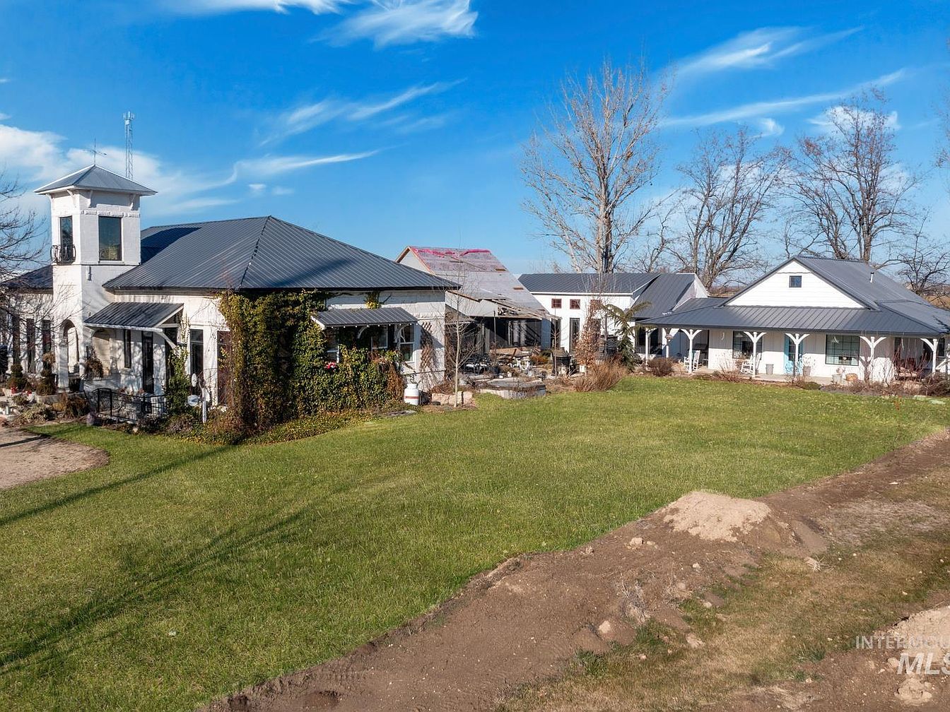 A sprawling historic American home set against a vibrant blue sky with wispy clouds. The house features white plastered walls, black metal roofs, and a striking tower-like structure on the left, evoking a country manor ambiance. Multiple buildings are connected with breezeways and shaded porches, some draped with vines and climbing plants. The central lawn is expansive but slightly uneven, bordered by simple garden beds, shrubs, and rock features. Elements like white columns, rocking chairs, and arched porch supports enhance the classic yet rustic aesthetic, blending seamlessly with the natural surroundings and mature leafless trees in the background.
