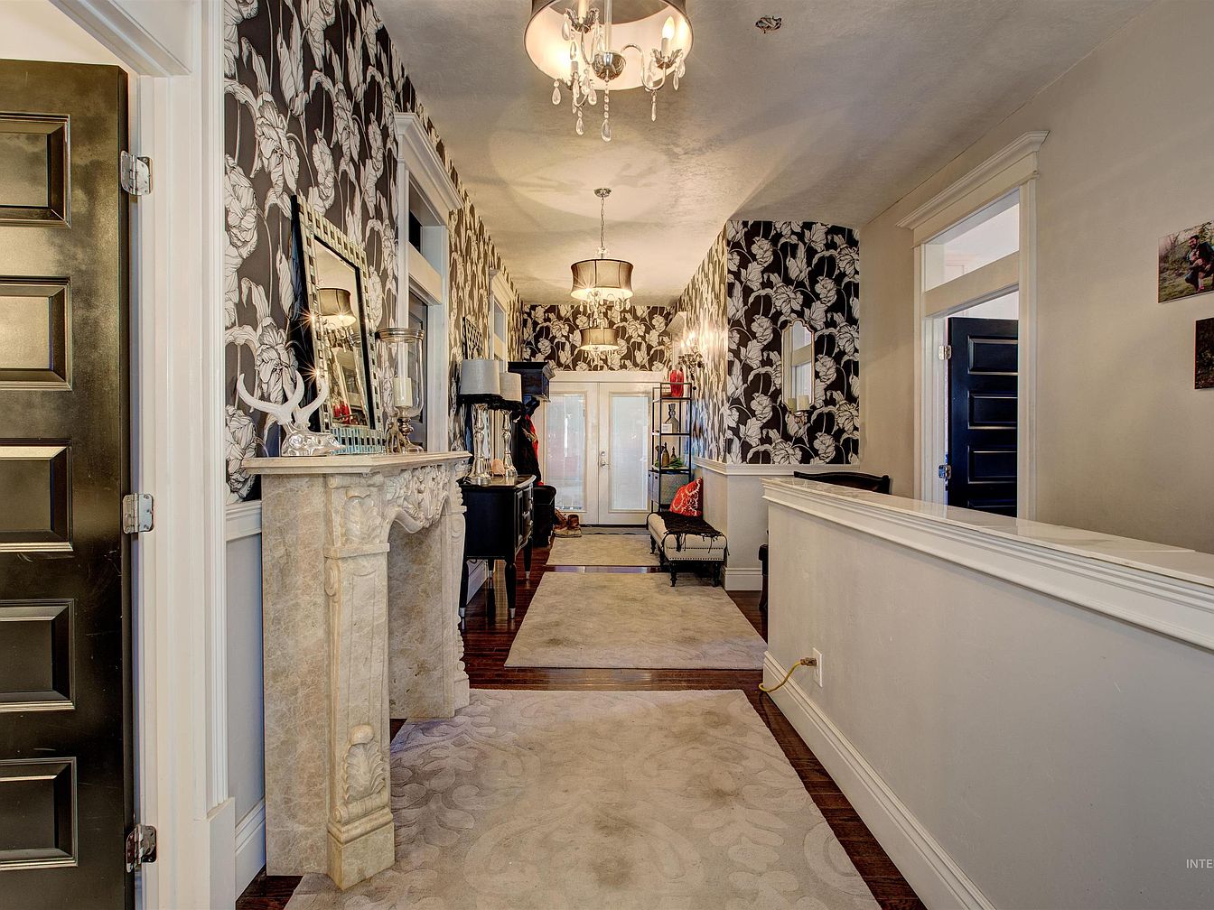 A long, elegant hallway features bold black-and-white floral wallpaper on one side and soft cream-colored walls opposite, creating striking contrast. The space is adorned with ornate white trim and molding, adding a sense of historic charm. An intricately carved marble mantel serves as a decorative console, displaying mirrors and candle holders. Crystal-accent chandeliers hang from the ceiling, lending sparkle and sophistication. Soft cream rugs run the length of the polished dark wood floors, offering warmth and comfort. Art and photographs are displayed tastefully on the walls, while black doors and classic furnishings complete the stylish, cohesive look.