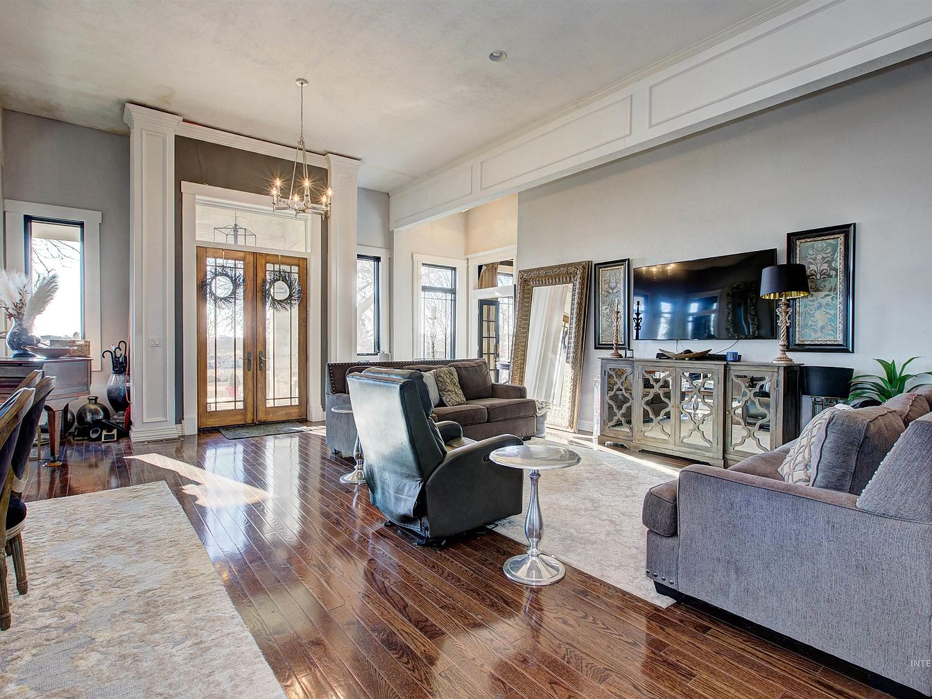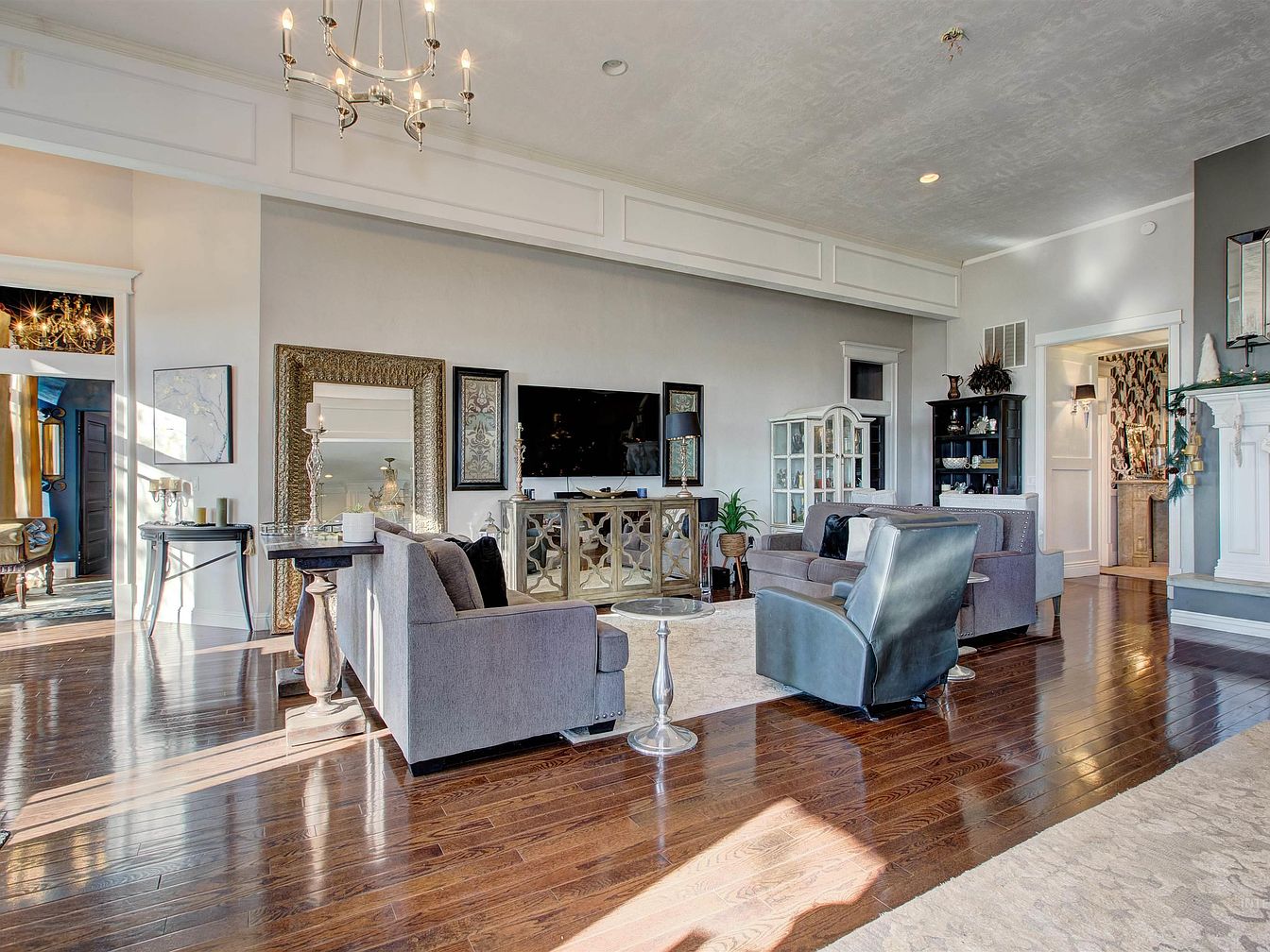 Spacious living room with a grand double-door entrance flanked by tall windows, allowing natural light to stream in. The space features rich, glossy hardwood floors and a blend of traditional and modern decor. Plush gray sofas and a black leather armchair are arranged around a glass-topped accent table on a neutral area rug. The opposite wall hosts an elegant mirrored media console, a large flat-screen TV, and ornate gold-framed mirrors and artwork. Soft blue-gray walls are accented by thick white crown molding and high ceilings. Decorative accents include a piano, tall candlesticks, and lush houseplants, creating a warm, inviting atmosphere.