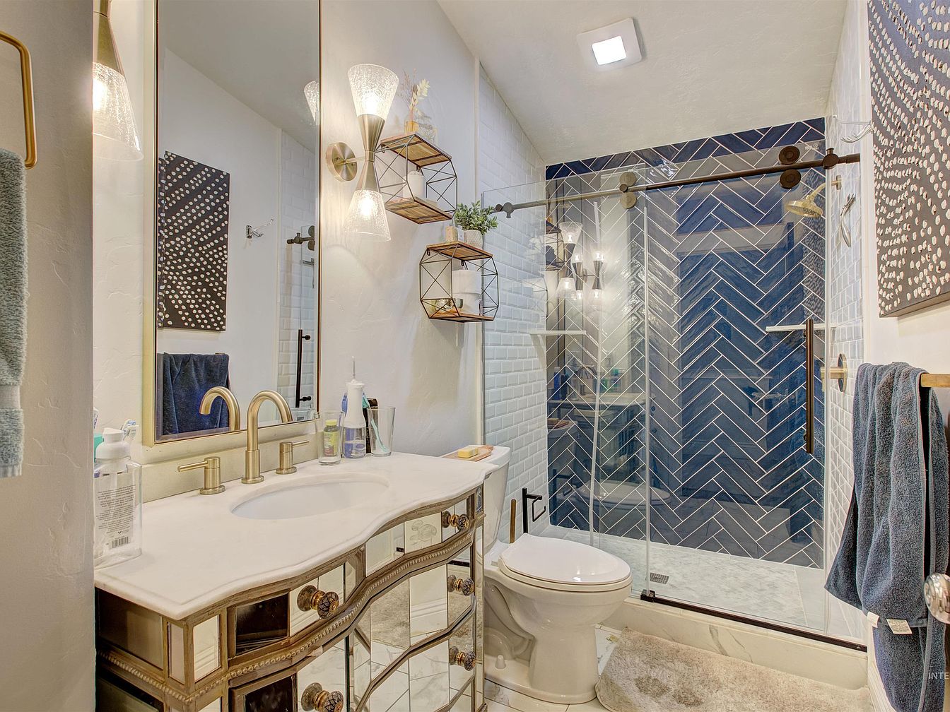 A chic, eclectic bathroom features a statement vanity with a mirrored, curved front and gold-toned fixtures. The countertop is marble, supporting an under-mount sink and a neat arrangement of toiletries. Above, a slim, tall mirror is flanked by two modern sconces with textured glass. The walk-in shower is encased in glass, showcasing navy blue herringbone tile contrasted by white subway tiles. Wall-mounted shelves with geometric metal frames hold decorative plants. The color palette mixes whites, creams, and blues, with gold accents tying the space together. Abstract dotted artwork and plush towels add a cozy, artistic touch.