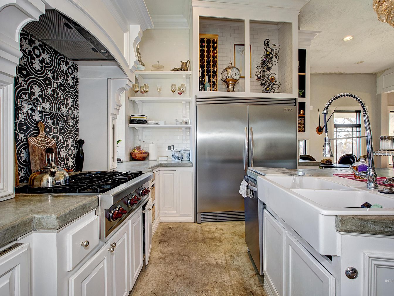 A spacious kitchen with a blend of traditional and modern elements fills the frame. Crisp white cabinetry lines the area, topped with concrete countertops. At the back, a large stainless-steel refrigerator is framed by open shelving displaying wine glasses, vintage items, and a dedicated wine rack. A patterned black and white tile backsplash behind the stovetop adds a bold decorative accent. The deep farmhouse sink with a high-arc stainless faucet sits on a substantial island. Pops of metallic from the kettle and subtle hints of color from accessories and barstools add charm to this otherwise neutral-toned, well-organized culinary space.