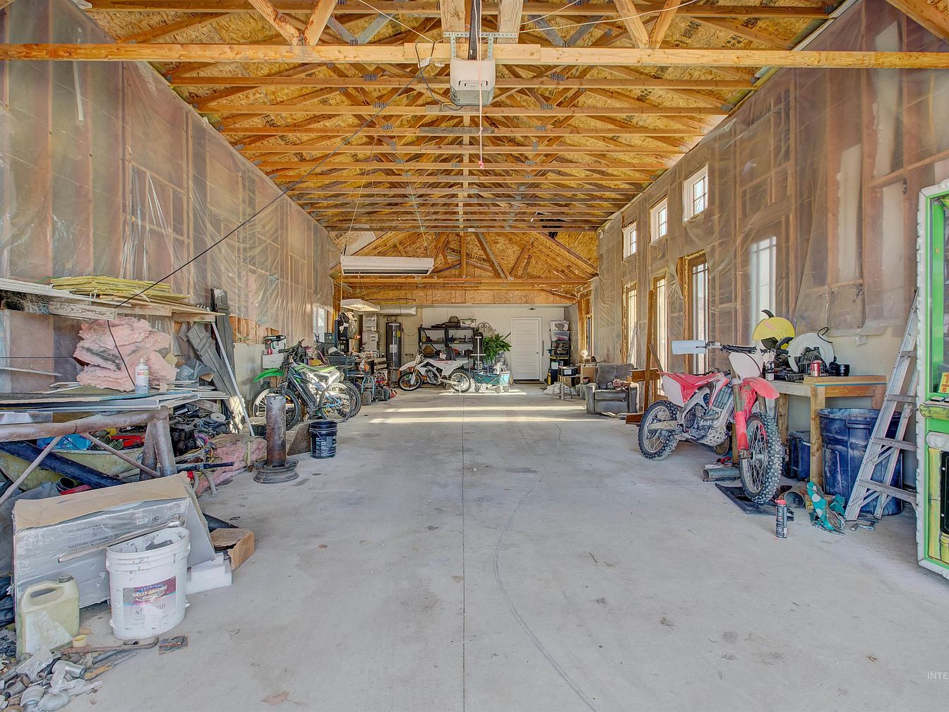 A large, unfinished garage with exposed wooden rafters and beams on the ceiling, showcasing a spacious, rectangular layout. The walls are lined with translucent plastic sheeting, covering insulation materials. Multiple windows on the right wall allow natural light to brighten the space. The floor is bare concrete, with scattered workbenches, tools, and motorbikes along both sides of the room. Cluttered shelves and stacked construction materials create a rugged, utilitarian atmosphere. A few chairs, storage bins, and various items are tucked against the back wall near a closed white door. The overall aesthetic conveys practicality and an active workspace.