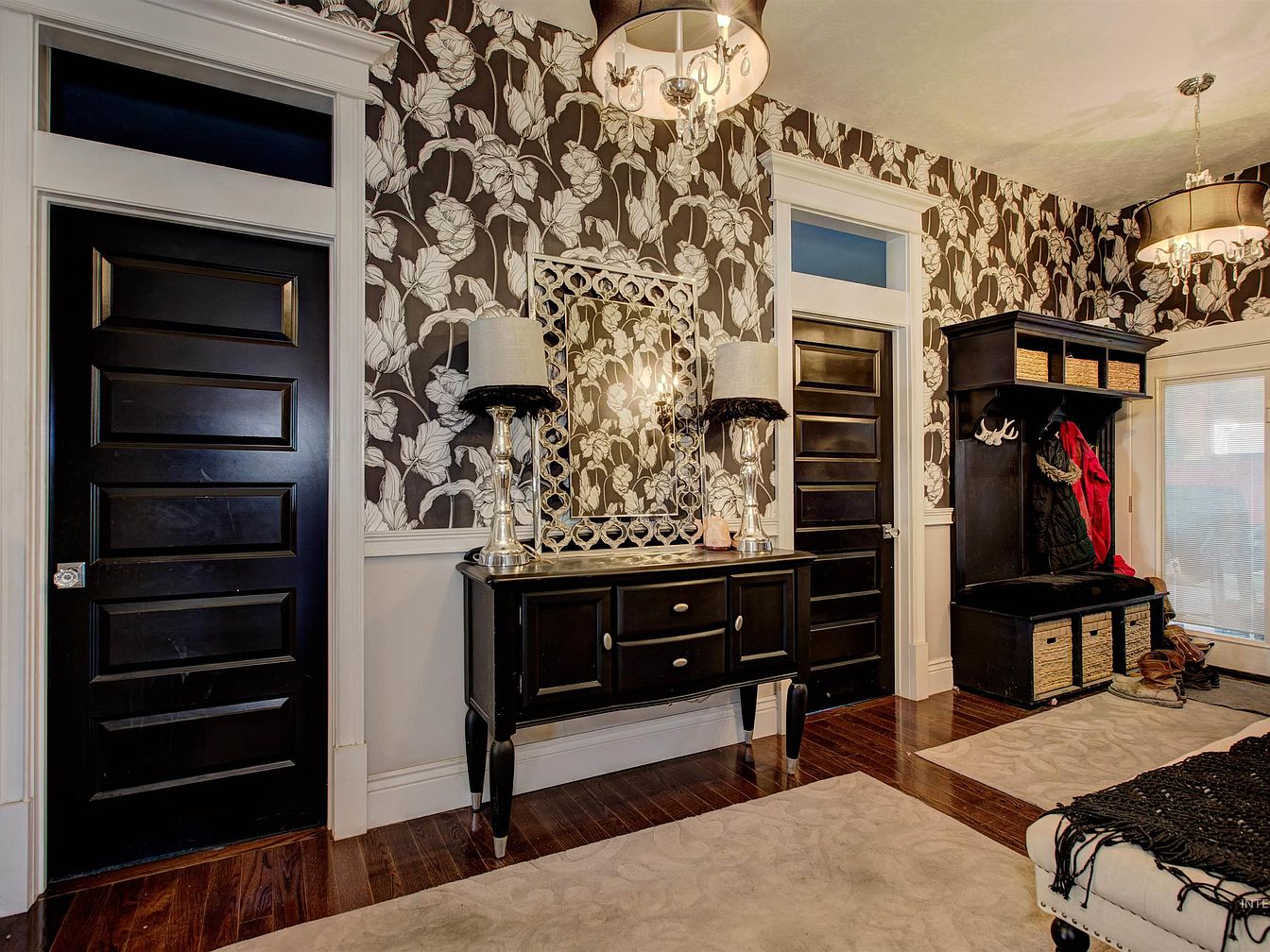 A historic home’s entryway features elegant floral wallpaper in black and white, creating a bold yet vintage atmosphere. Black paneled doors with white trim stand prominently along the walls, providing contrast and a sense of structure. A classic sideboard with silver lamps and a large decorative mirror adds sophistication. The far wall incorporates a bench with cubbies and hanging hooks, combining functionality for coats and shoes with rustic charm. Warm, dark wood floors and plush beige rugs lend coziness, while two large drum-shaped chandeliers with glass accents deliver soft, welcoming lighting.