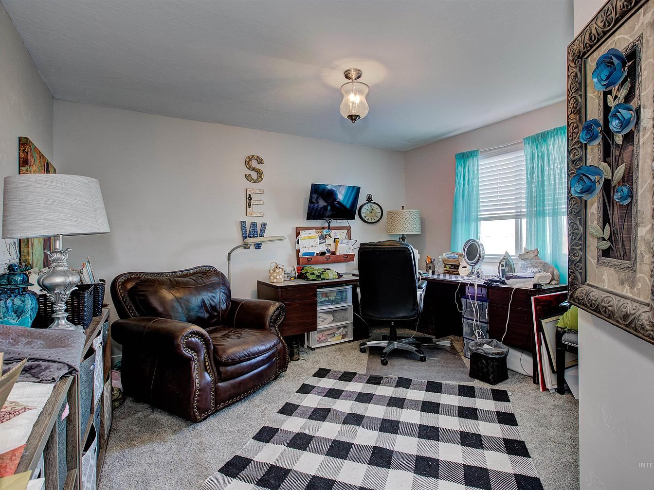 A cozy and creative home office space features a mix of classic and personal touches. The room has soft gray carpet, neutral walls, and is lit by a semi-flush ceiling light with a glass shade. A large, brown leather armchair sits to the left near a dark wood shelving unit topped with a silver lamp. In front of a window with turquoise curtains, a long wooden desk holds organizing bins, a desktop mirror, and a variety of office supplies. A checkered black-and-white area rug anchors the room, while wall art, a small clock, and decorative letters spelling ‘SEW’ add charm.