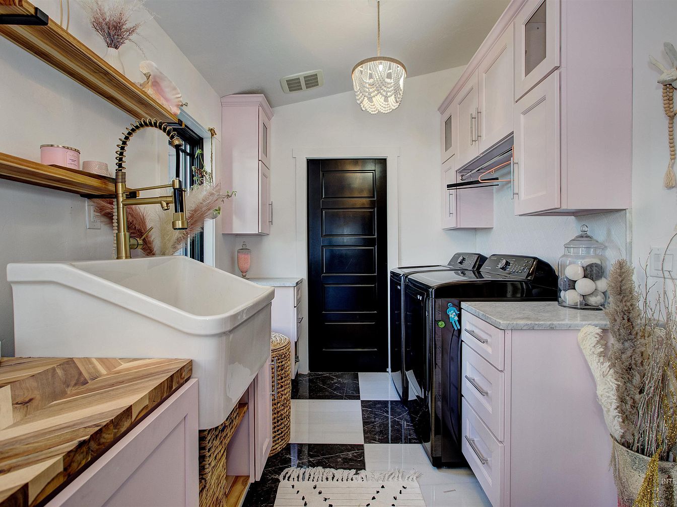A narrow laundry room featuring blush-pink cabinetry and black appliances with a stacked washer and dryer. The countertops are a light gray stone, complementing the black-and-white tiled floor. On the left, a large farmhouse sink with a brass industrial-style faucet sits above natural wood countertops and woven storage baskets. Open wooden shelves hold decorative items like pink candles, ceramic vessels, and dried floral arrangements, adding a soft feminine touch. A small chandelier with beads hangs from the ceiling. A glass jar filled with decorative balls and accents of dried pampas grass provide added warmth and visual interest to the space.