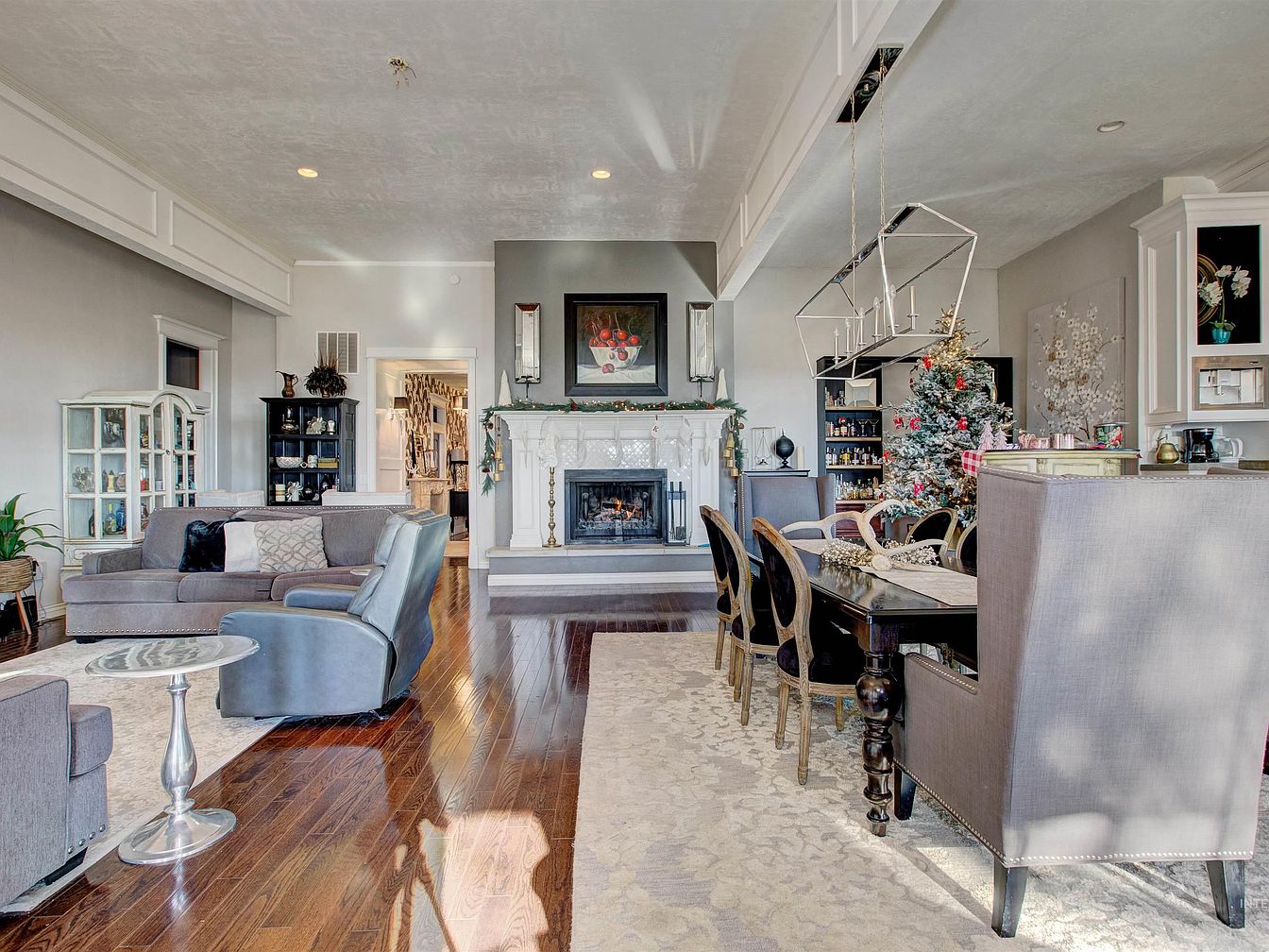 Open-concept area combining both the living and dining rooms, featuring a harmonious color palette of soft grays, creams, and deep wood tones. The living area has elegant gray seating arranged around a glass-topped side table and a classic white mantel fireplace adorned with green garland. The floors are polished hardwood with large area rugs demarcating each section. The dining area includes a long wooden table with mismatched chairs, some upholstered in gray; above hangs a modern geometric chandelier. A decorated Christmas tree and cabinets displaying decor add festive and refined touches, while high ceilings with elaborate trim provide architectural interest.