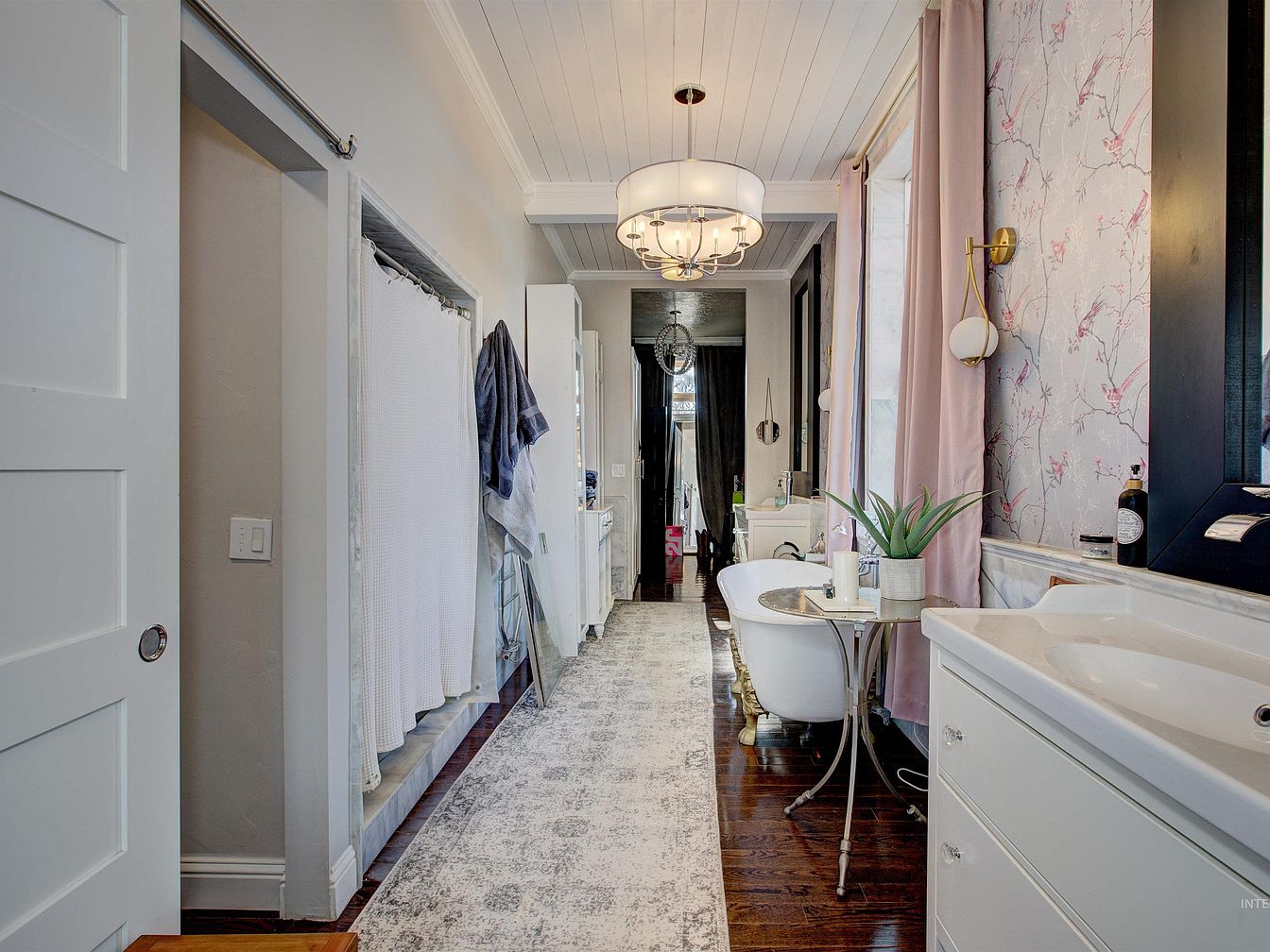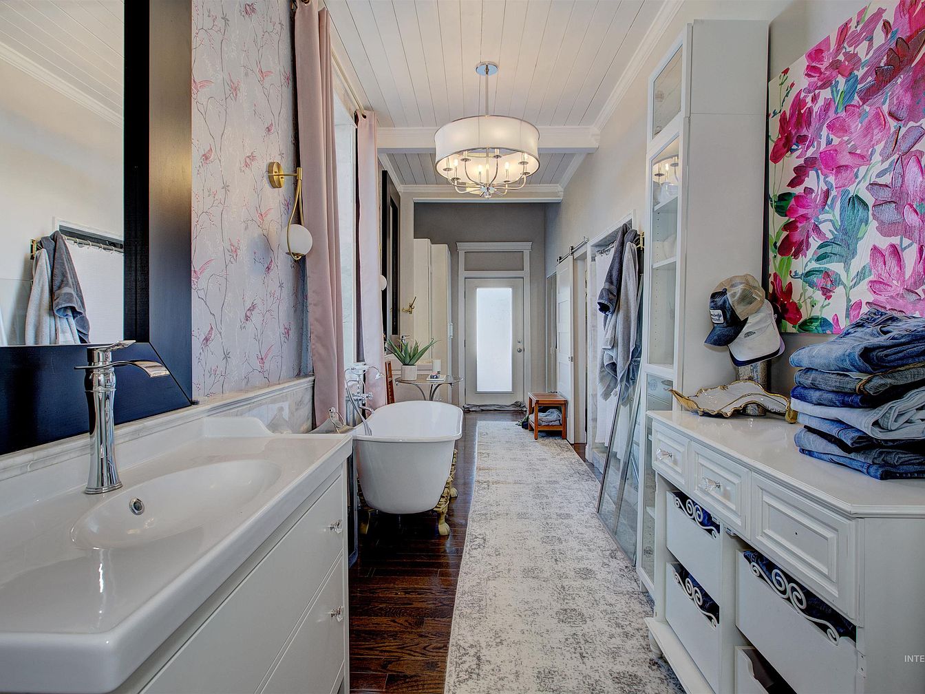 A long bathroom features white shiplap ceilings and dark wood flooring, creating a blend of farmhouse charm and modern style. On the left, a sleek white sink vanity with a high-arc chrome faucet sits beneath a large, black-framed mirror, and a wall lined with soft pink floral wallpaper and gold-trimmed sconces adds elegance. A freestanding clawfoot bathtub is positioned by a window dressed in pale blush curtains. On the right, a white storage unit houses folded jeans and hats, topped with a vibrant pink floral painting. Overhead, a contemporary chandelier adds soft, ambient light. The entry door and hallway are framed by light gray walls.