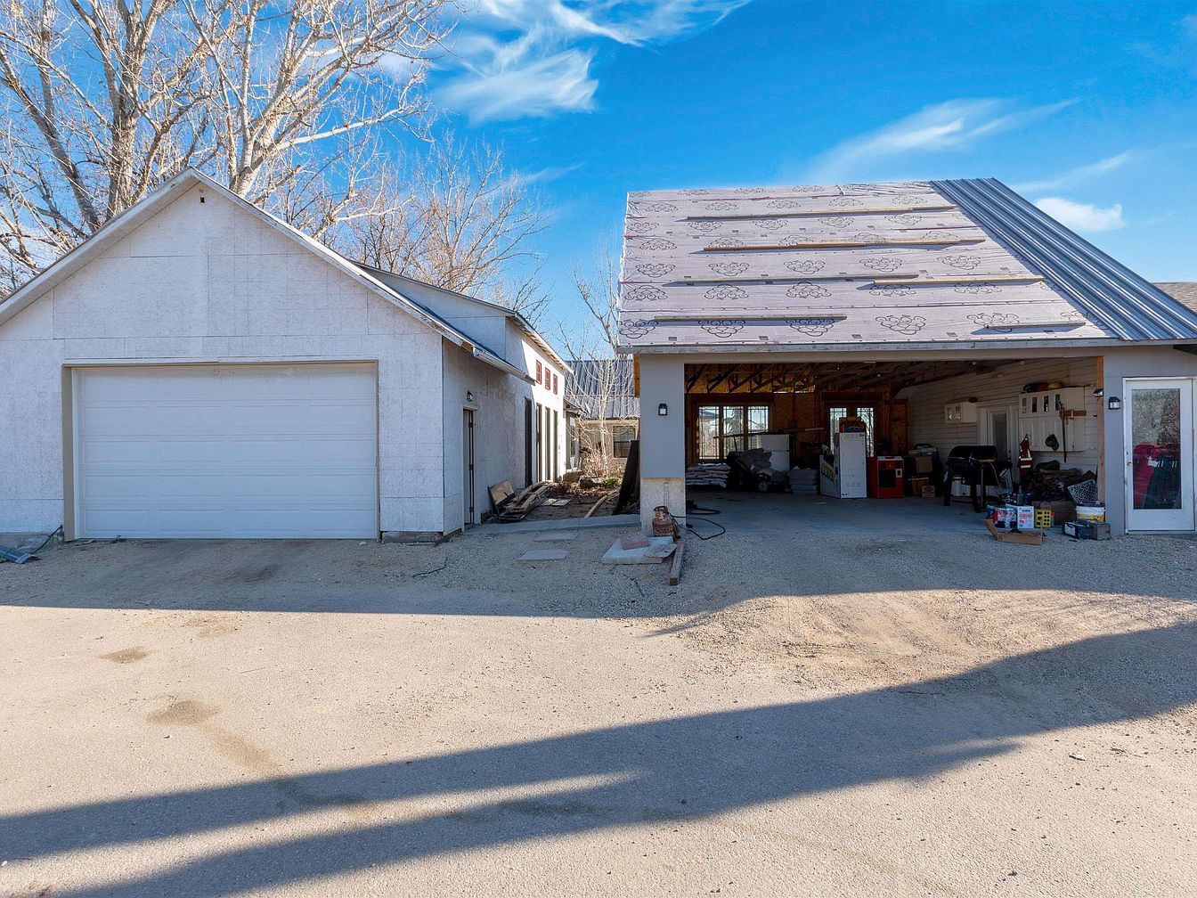 A large, detached garage area with two distinct sections is visible under a clear blue sky; one section is fully enclosed with a white garage door, while the other section is partially open and currently undergoing roof construction with matted insulation and some new metal roofing. The open garage contains various tools, building materials, and boxes along its interior. The ground in front of the garage is a mixture of packed dirt and gravel, and there are scattered construction supplies nearby. Leafless trees in the background add to a rustic, utilitarian atmosphere. The space feels practical and unfinished, with a focus on function.