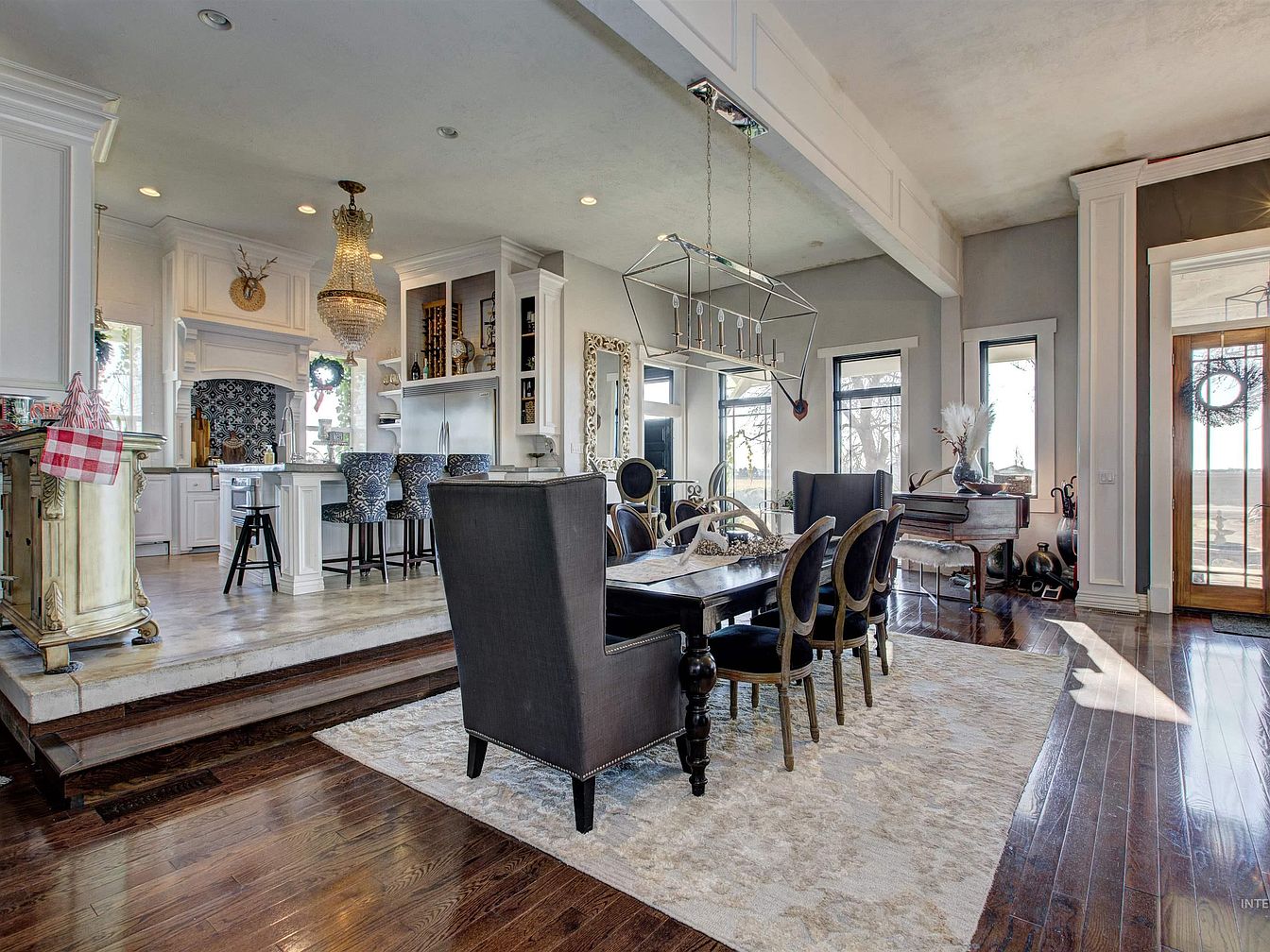 An open-concept space connects the dining room and kitchen, featuring high ceilings and elegant molding. The dining area centers on a dark wood table with six upholstered chairs, two of which are high-backed wing chairs. Light pours in from large windows flanking the entry, highlighting the grand piano and decorative pieces nearby. The kitchen, elevated by two steps, boasts white cabinetry, a patterned tile backsplash, and a prominent chandelier above the island with three patterned stools. The hardwood floors contrast beautifully with the creamy area rug and crisp white walls, balancing traditional and contemporary touches throughout the space.