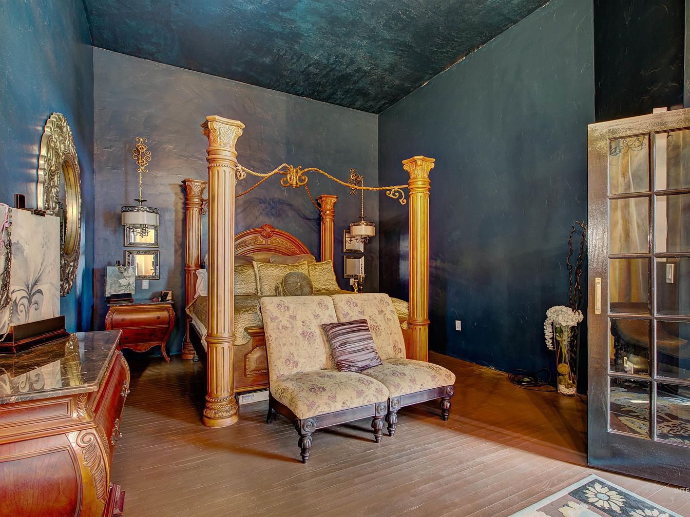 Rich navy blue walls and ceiling enclose an opulent bedroom featuring a dramatic four-poster bed with ornate golden columns and decorative scrollwork overhead. In front of the bed sits an upholstered, floral-patterned settee with a coordinating accent pillow. To the left, a highly polished wood dresser and matching nightstands with elegant curves and brass hardware echo the room’s classical aesthetic. A large, gold-framed circular mirror adds grandeur, while crystal-chained pendant lights provide illumination. French doors with glass panels allow entry, and fresh white flowers in a vase soften the dark, regal surroundings, creating a stately, atmospheric retreat.
