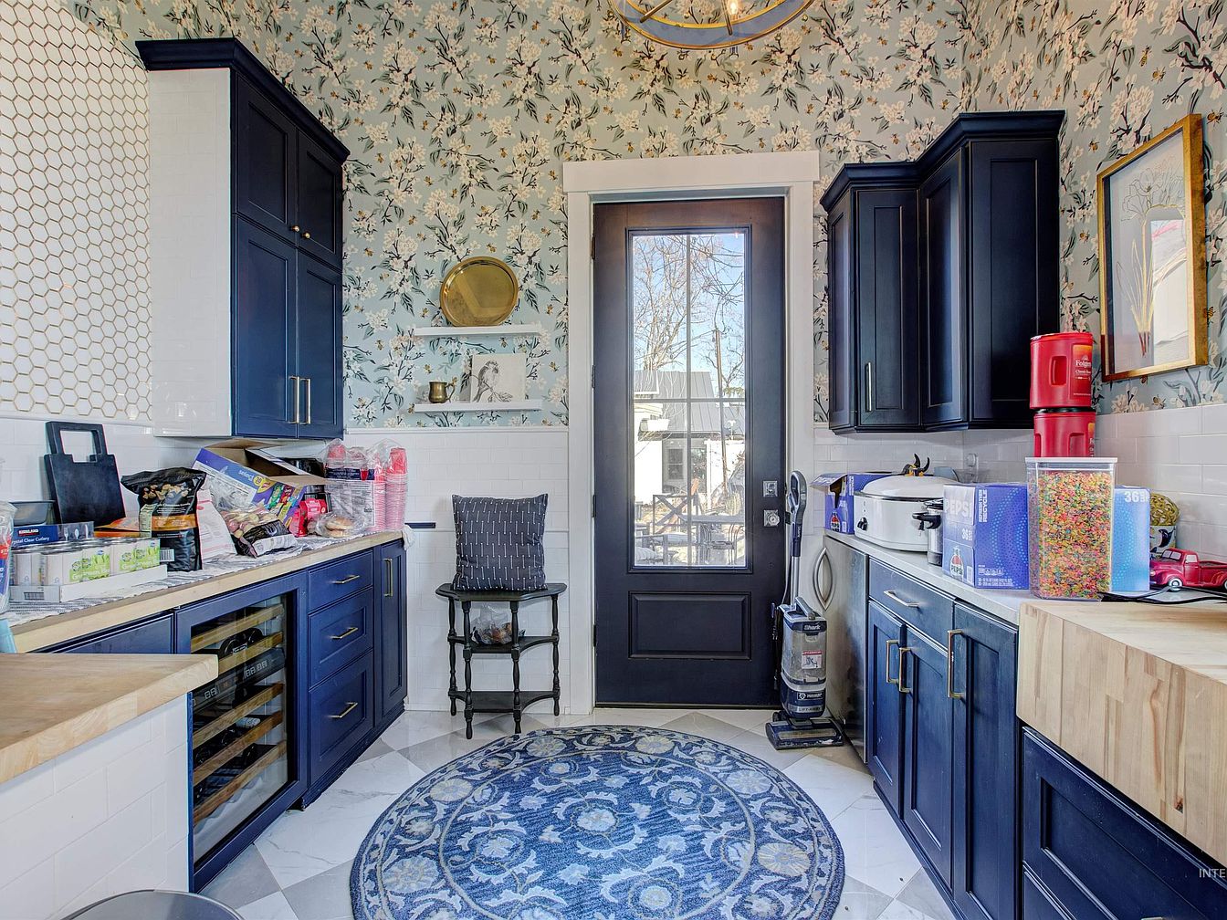 A small, well-lit pantry area with a glass door leading outside, featuring rich navy blue cabinetry with gold hardware and white tile backsplash. The counters hold small kitchen appliances and snacks, with a mix of storage containers and pantry items. A round blue and white patterned rug covers the white marble tile floor. The walls are adorned with blue floral wallpaper, creating a vintage yet vibrant look, accented by a gold-framed painting and small shelves displaying decorative items. Natural light brightens the space, reflecting off the classic moldings and clean lines of the cabinetry and trim.