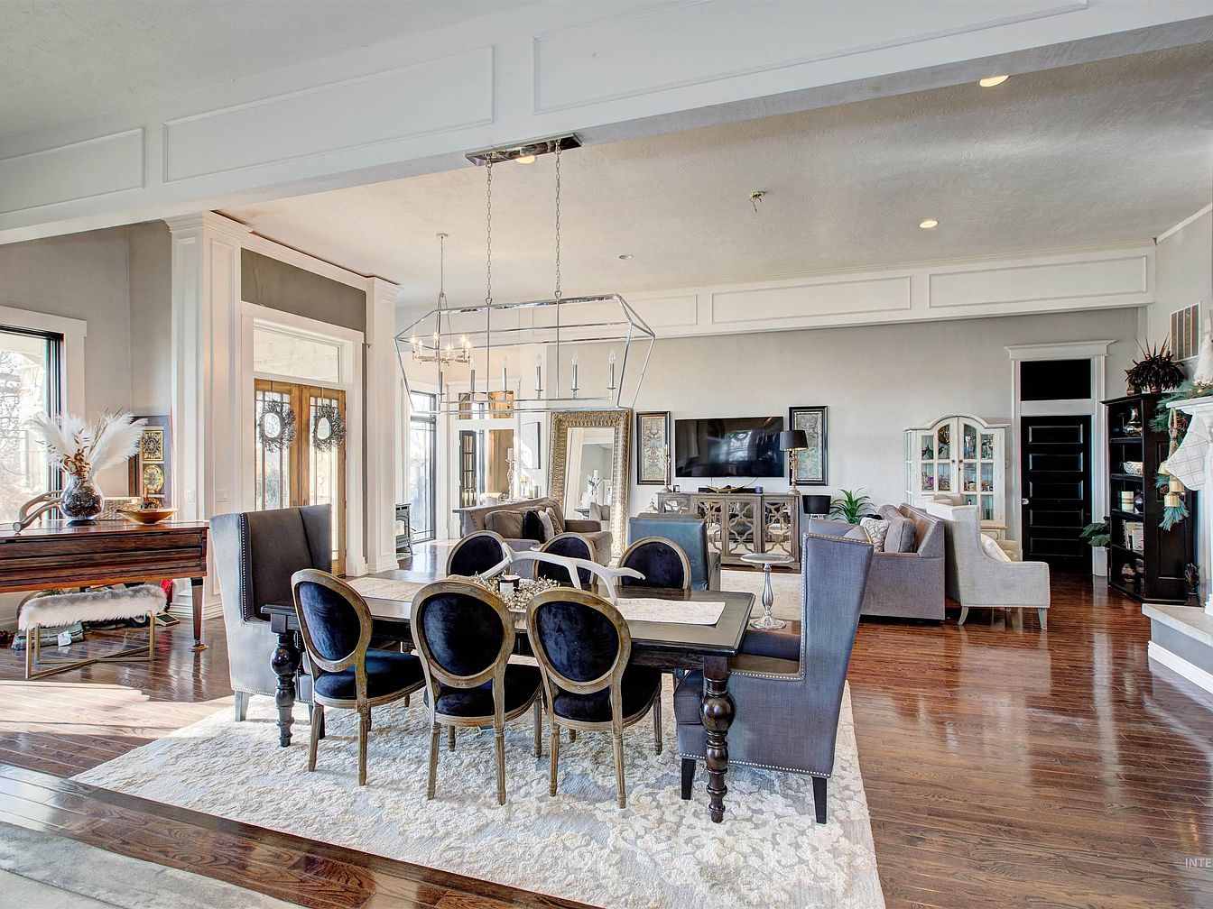 An inviting dining space merges gracefully with the living area, set on polished wooden floors and defined by a textured cream area rug. The centerpiece is a rectangular table surrounded by elegant navy-blue velvet chairs with curved wooden frames, flanked by larger, studded armchairs at each end. Overhead, modern geometric chandeliers offer a touch of contemporary style. Muted light gray walls with white decorative trim add a refined backdrop, while large windows and double entry doors bring in ample natural light. A grand piano sits to one side, enhancing the sophisticated and welcoming atmosphere of the open-concept space.