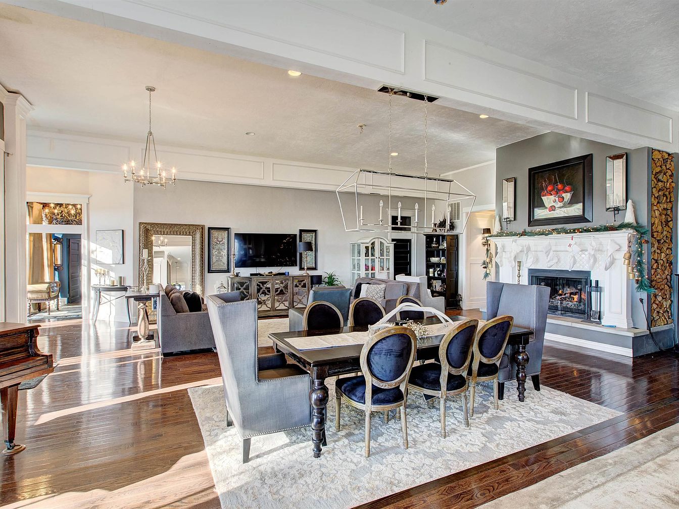 A grand open-concept living and dining space with a luxurious, welcoming atmosphere. Elegant dark wood floors run throughout, anchored by a large cream area rug beneath a long dining table surrounded by blue velvet chairs and tall wingback armchairs. Past the dining area, a cozy seating nook faces a large flat-screen TV mounted above a mirrored console. A white ornate fireplace, draped with garland and hung with stockings, serves as the focal point, flanked by vertical mirrors and artwork. Light streams through tall windows, illuminating architectural ceiling moldings, a chandelier, and a baby grand piano in the corner.