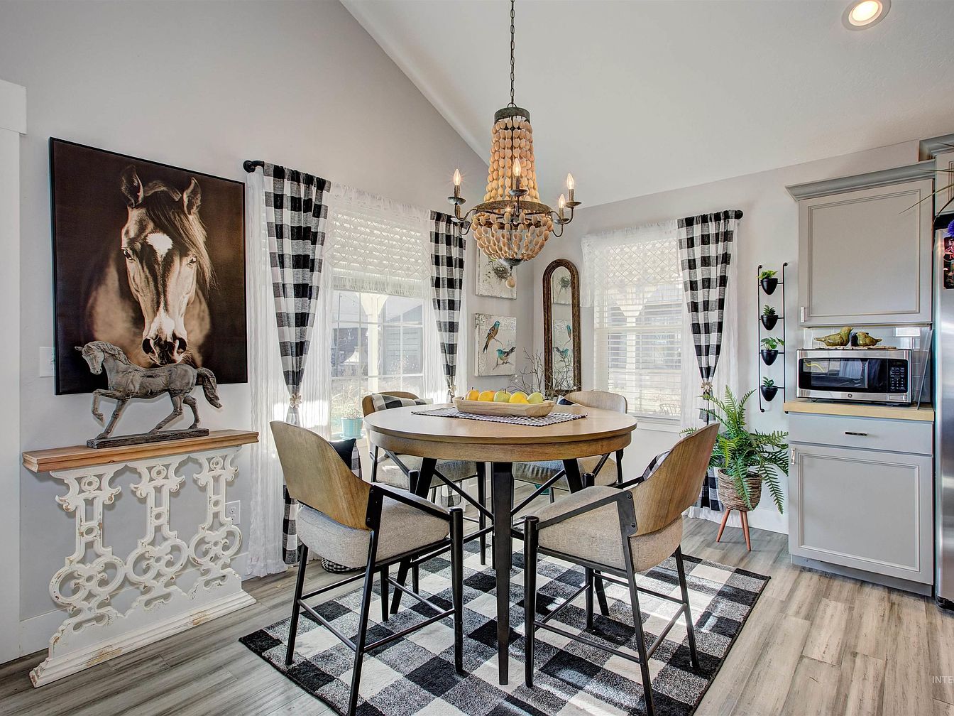 A light-filled breakfast nook features a round wooden table surrounded by four modern upholstered chairs, all set atop a black and white checkered rug. The walls are painted a soft gray, offering a calming backdrop for the dramatic horse art and decorative white carved console table topped with a horse figurine. Two large windows with sheer and plaid curtains flood the space with natural light. A beaded chandelier hangs above the table, while touches of greenery, a vertical planter, and framed bird artwork add a rustic charm. The adjacent cabinetry is painted in a muted gray, contributing to a cozy farmhouse feel.