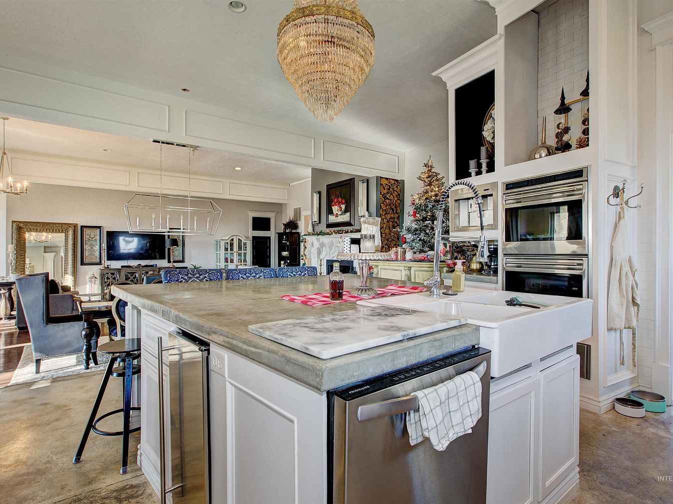 Spacious kitchen featuring a large island with a marble and concrete countertop in the center, complemented by white cabinetry and stainless steel appliances, including a double wall oven. A farmhouse-style white sink with a modern pull-down faucet sits at the island’s edge. Hanging above is a striking tiered chandelier made of beads, adding an elegant touch. The adjoining living and dining area is visible, with a blue upholstered breakfast bar along the back of the island. Neutral tones and gold elements, such as the framed mirrors and industrial lighting, contribute to a warm, historic, yet contemporary aesthetic.