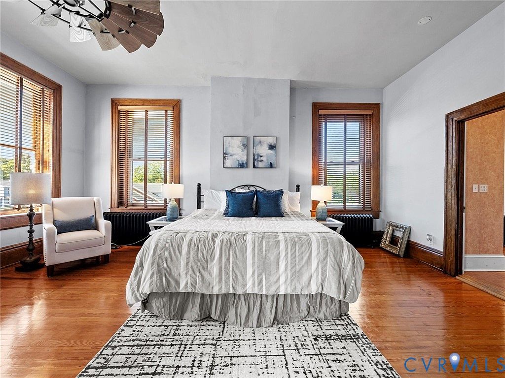 This spacious bedroom features hardwood flooring with a warm, rich tone, complemented by the classic wooden window frames and doorways. A large bed with a light gray, textured comforter is the focal point, adorned with decorative pillows in shades of blue for a calm aesthetic. Illuminating the space, a stylish ceiling fan hangs above, while natural light streams through lined, wooden blinds. A cozy armchair with accent cushions sits beside a small side table, providing a reading nook. Artwork in light blue tones adds depth to the walls, enhancing the soothing atmosphere. A doorway leads to an adjacent bathroom.