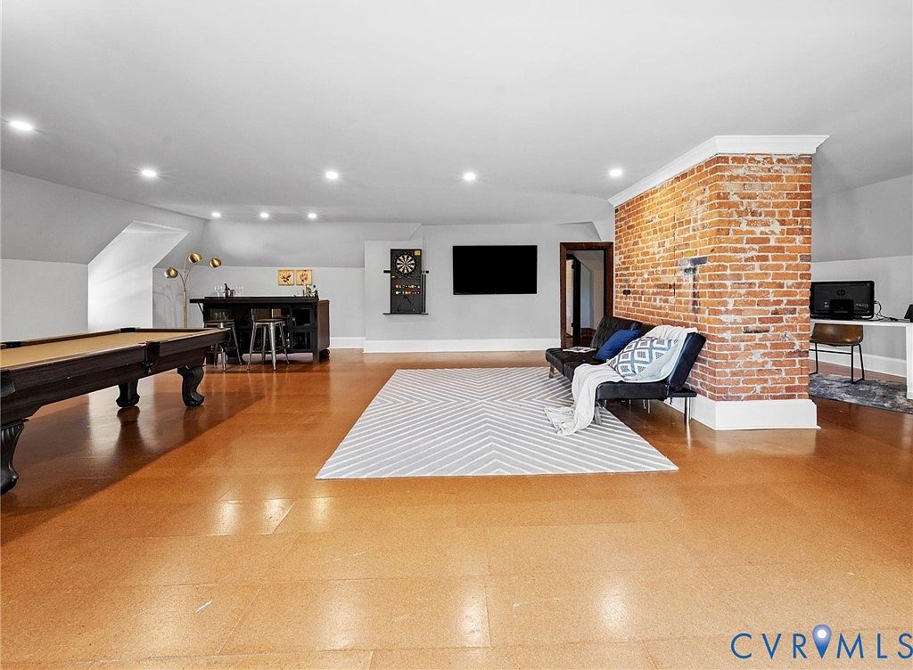 This spacious game room features a warm color palette anchored by a rich, polished cork floor. A striking rustic brick wall adds character and separates the space, complemented by soft recessed lighting overhead. To one side, a pool table invites entertainment, while a stylish sofa adorned with decorative pillows offers comfortable seating. A large area rug with a modern chevron pattern provides a visually appealing focal point. Adjacent, a sleek black bar-style table with high stools serves as a casual dining area, and a dartboard hangs on the wall, enhancing the room’s recreational vibe.