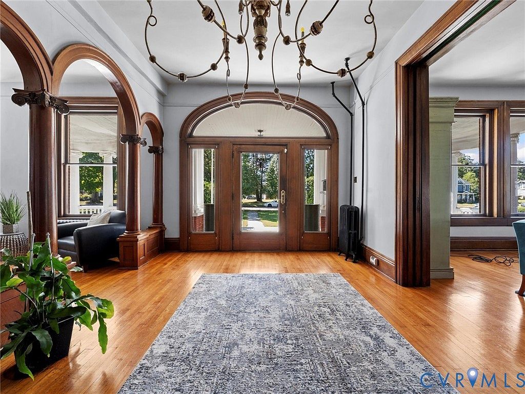 The entryway features an expansive wooden floor that enhances the room’s warmth. Two tall, arched doorways lead outside, flanked by elegant columns that showcase classic architectural details. A striking chandelier hangs from the ceiling, emphasizing the room’s height and grandeur. A large area rug with intricate patterns adds texture, contrasting with the sleek hardwood. On one side, a cozy seating arrangement invites relaxation, while a vibrant green plant adds a touch of nature. Natural light floods in, illuminating the soft gray walls and further enhancing the welcoming atmosphere of this historical space.