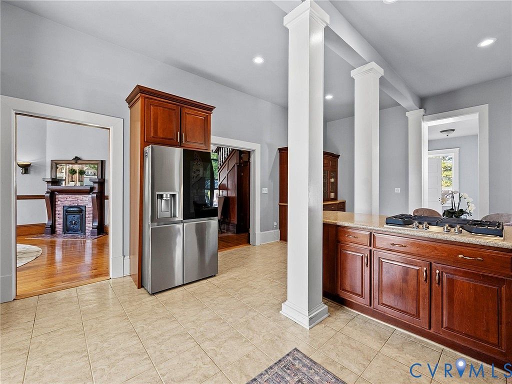 A spacious kitchen with a warm and inviting atmosphere, featuring rich mahogany cabinets and modern stainless steel appliances. The layout is open, connecting to adjacent rooms through wide doorways. A large island with a granite countertop serves as a central workspace, complemented by a gas stove. The flooring is a light beige tile, adding brightness to the space. Pillars support the high ceiling, enhancing the airy feel. Natural light floods in from nearby windows, while a decorative rug on the floor adds a touch of coziness, balancing contemporary elements with classic charm.