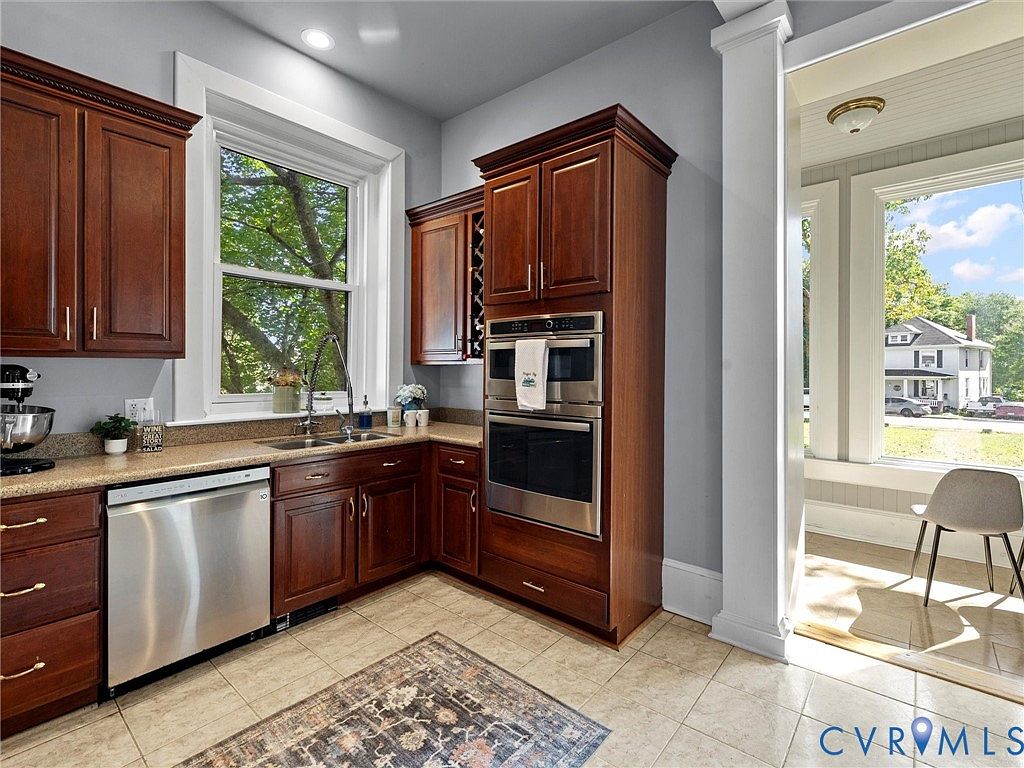 This kitchen showcases a blend of modern and traditional aesthetics, featuring rich wooden cabinetry with deep tones complemented by a light beige countertop and tile flooring. Large windows flood the space with natural light, enhancing the warmth of the wooden elements. Stainless steel appliances, including a dishwasher and built-in oven, offer a sleek contrast to the wood. A decorative area rug adds coziness, while potted plants provide a touch of greenery. The layout promotes efficiency with ample counter space and storage, making it an inviting area for both cooking and gathering.