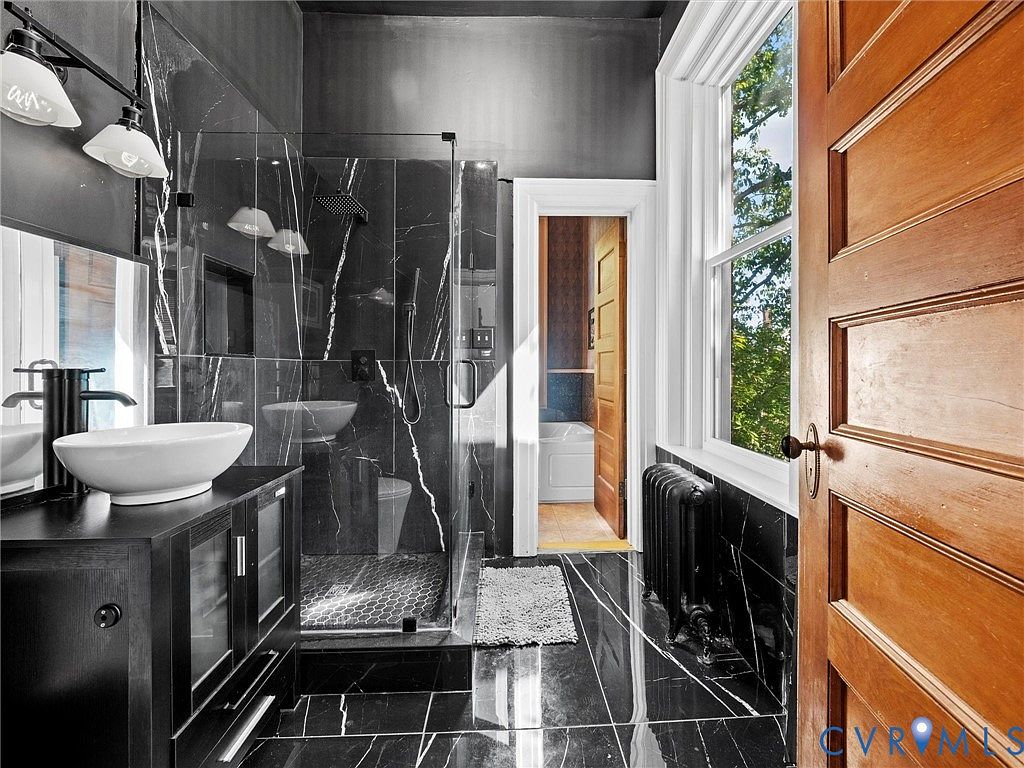 This bathroom features a striking black marble design that covers the walls and floor, creating a dramatic and elegant atmosphere. A sleek, modern vanity with a round vessel sink complements the rich textures. The shower area, enclosed in glass, showcases dark accents, while stylish wall-mounted lights provide illumination. Large windows allow natural light to flow in, highlighting the intricate details of the marble. A soft rug sits beneath the vanity, adding comfort to the space. The door on the right leads to a separate area, framed by classic architectural elements like white trim and a vintage radiator.