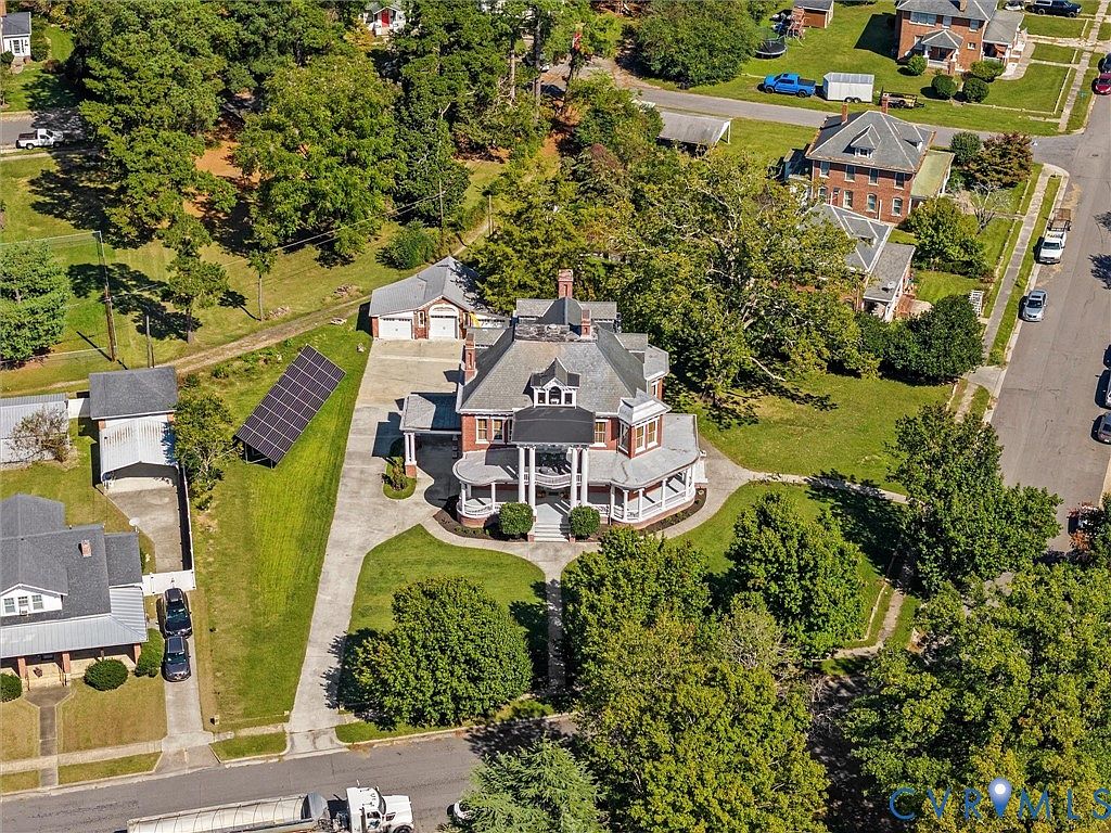 The Oliver Mansion, built in 1910 in Crewe, VA, is a distinguished Colonial Revival home known for its historical significance, having been constructed by T. B. Oliver, instrumental in advancing public health by providing clean drinking water. This 4,964 sq ft residence boasts 5 bedrooms and 5 baths, featuring exquisite craftsmanship with 11-foot ceilings, hardwood floors, and six fireplaces. Recent renovations enhance its charm while integrating modern amenities, including remodeled bathrooms and energy-efficient solar panels. The property sits on a generous lot, complemented by a 3-car garage, and is listed for $485,000, combining small-town charm with rich history, perfect for those looking to immerse themselves in Crewe’s legacy.